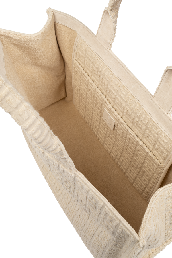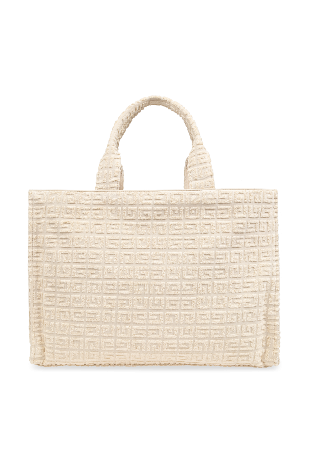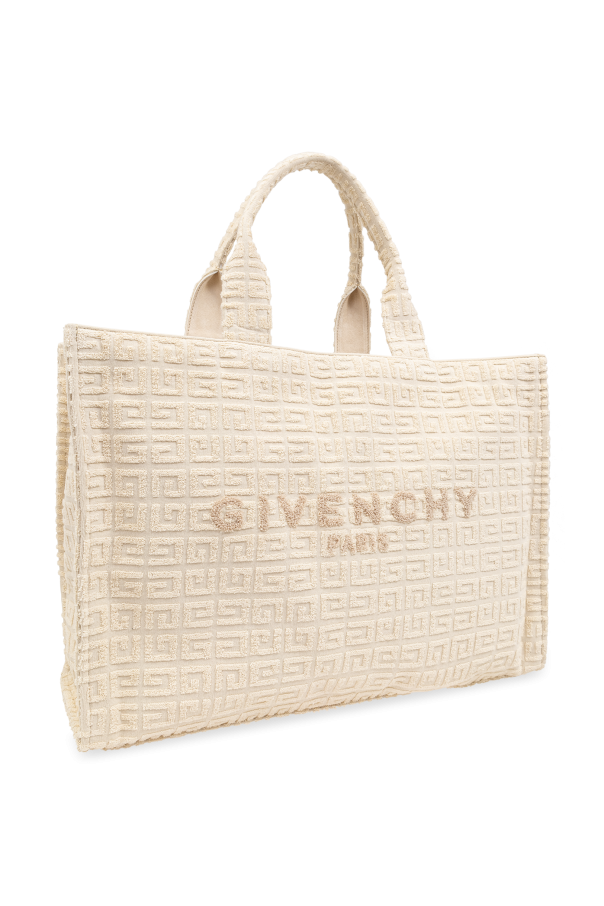 Introducing the epitome of sophistication and functionality - the G-Tote Medium from the prestigious house of Givenchy. This shopper tote, rendered in a sublime cream hue, showcases the elegance of simplicity fused with the allure of luxury. Its rectangular silhouette, defined by crisp vertical edges, serves as a canvas for the iconic Givenchy monogram pattern, embossed across the entirety of the bag’s surface, culminating in the proud display of \"GIVENCHY PARIS\" on the front. Constructed from a durable textile blend of 87% cotton and 13% polyamide, the G-Tote Medium offers not only a sturdy and practical form but also a tactile experience of luxury. The bag\'s medium-length handles are crafted for resilience, ensuring a comfortable shoulder carry, perfect for the discerning shopper on the go. Its spacious main compartment is devoid of unnecessary dividers, amplifying its utility as a shopping tote, while a sleek, internal slip pocket provides a secure spot for essentials like keys and wallet. The G-Tote Medium stands out for its elegant minimalism, eschewing additional adornments for a focus on the tastefully embossed monogram and Givenchy Paris inscription. This design choice underscores the tote’s chic, understated aesthetic, making it instantly recognizable as a Givenchy creation. Why Invest in This Product? Exceptional quality and craftsmanship synonymous with the Givenchy brand. Elegant and minimalist design, featuring the iconic Givenchy monogram. Practical and spacious interior, with a dedicated pocket for small essentials. Durable material composition, ensuring longevity and resilience. An embodiment of luxury and sophistication, suitable for a variety of occasions.