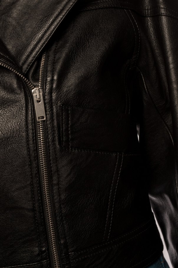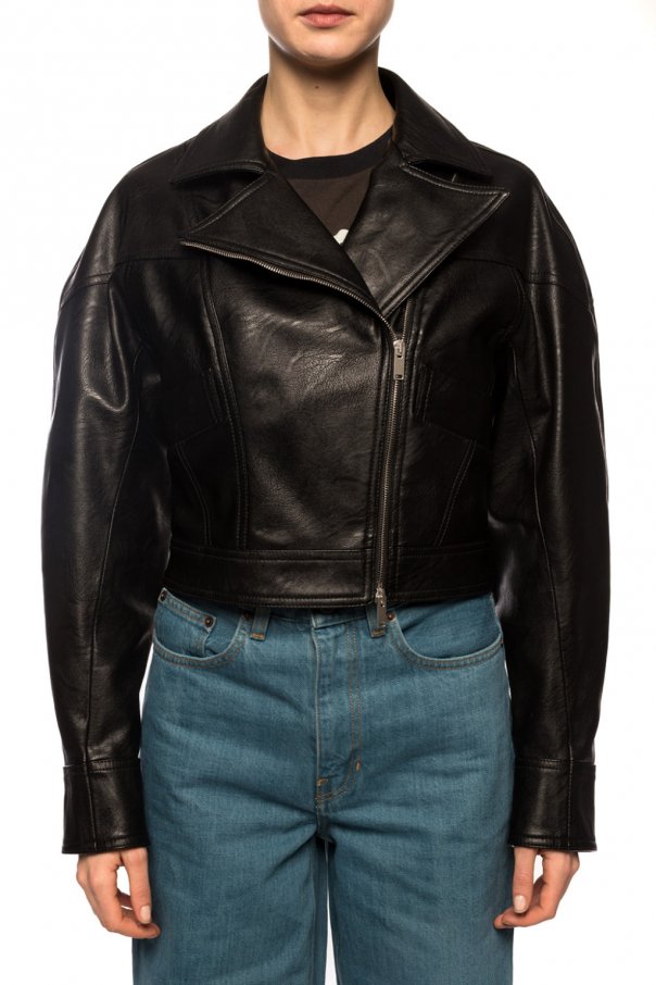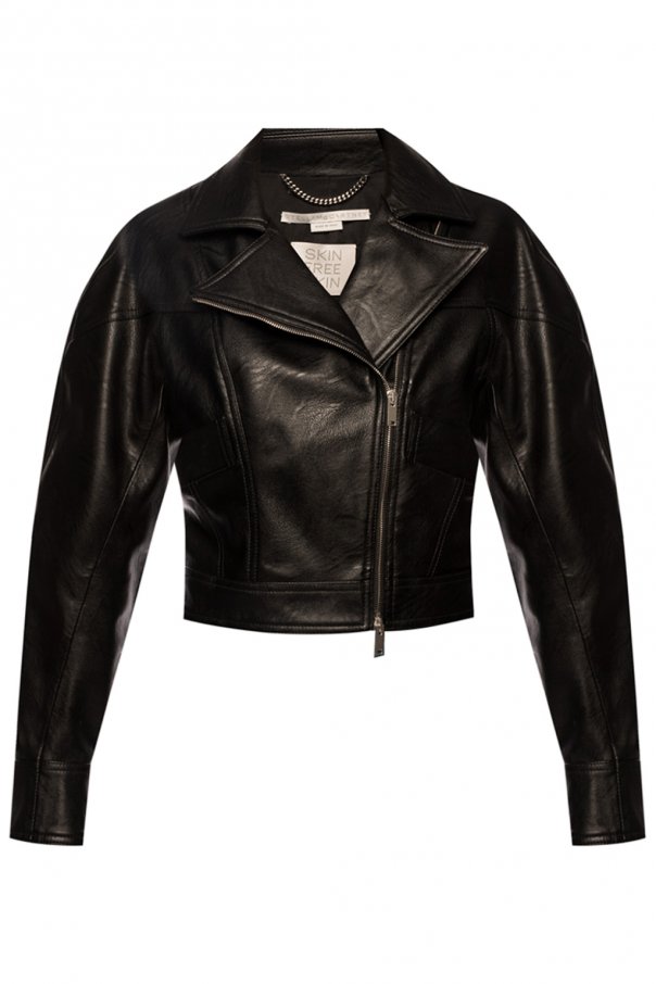 Black biker jacket from Stella McCartney. Made of eco-leather. Detailed with two-way zip closure and two slip front pockets.
