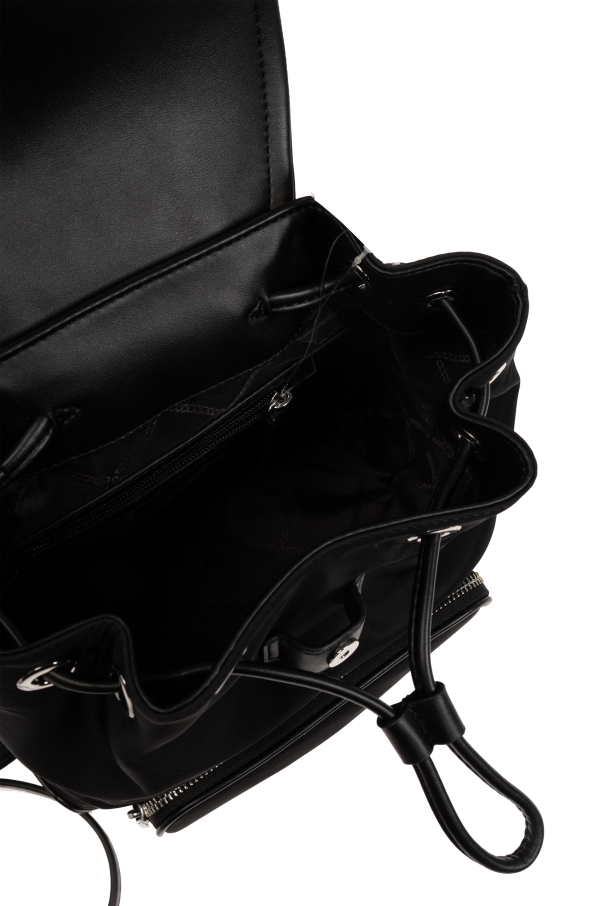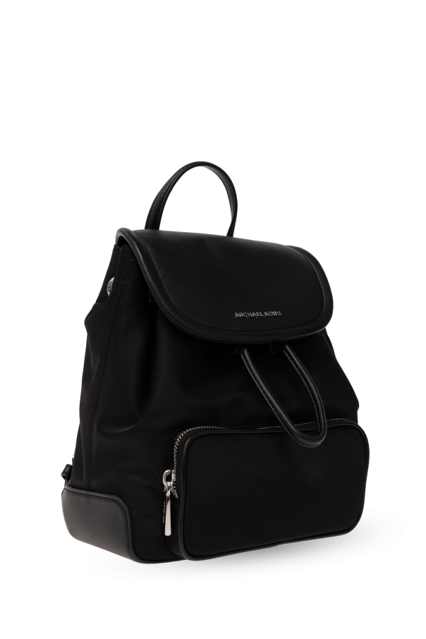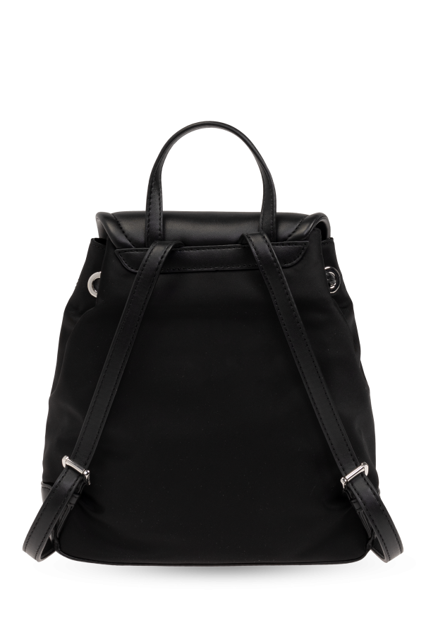 Introducing the \'Cara Small\' backpack by Michael Michael Kors, a paragon of elegance and versatility for the contemporary woman. This exquisite piece is meticulously crafted from a blend of premium technical fabric and faux leather, ensuring both durability and a sleek aesthetic. Its uniform black hue exudes a timeless elegance, making it an impeccable choice for an array of ensembles. The backpack\'s classic rectangular silhouette with rounded edges infuses a touch of modernity, while the shiny silver logo adorning the front flap is a testament to its distinguished lineage. Functionality is not overlooked—the external pocket with zip closure, along with an ample interior featuring additional zippered compartments, cater to all your essentials with ease. Adjustable shoulder straps and a convenient top handle offer versatile carrying options, ensuring comfort and style go hand-in-hand. Notable for its refined details, the \'Cara Small\' is accentuated with silver metallic finishes, including the snap closure and zipper embellishments, which enrich its sophisticated allure. Whether you\'re navigating the daily commute or embarking on a leisurely outing, this backpack is a testament to impeccable taste and practicality. Why Choose the \'Cara Small\' Backpack? Expertly crafted from high-quality materials for lasting appeal. Elegant design with a versatile black color palette. Signature designer logo as a mark of luxury. Functional features including external and internal pockets for organized storage. Adjustable straps and a top handle for multiple carrying options. Chic silver metallic accents for an elevated look.
