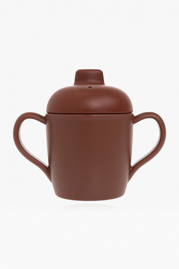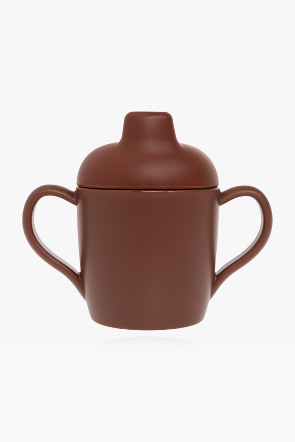 Set of two sippy cups in light beige and brown from Konges Slojd. Made from silicone, both items feature two practical handles and a removable lid with a small spout. One cup has a colourful print with cherries. Good for practicing first sips.