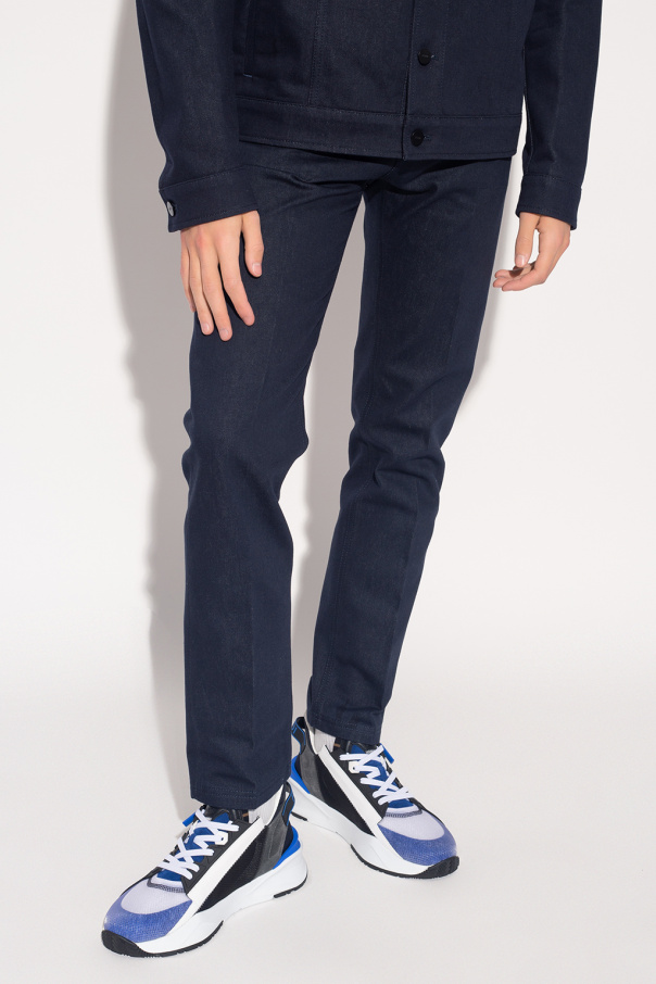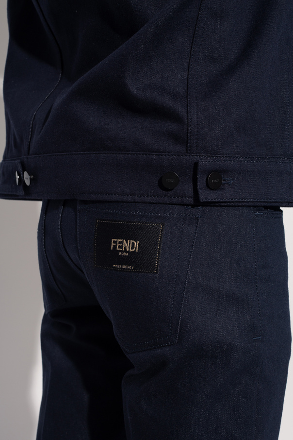 Navy blue jeans from Fendi. Made of cotton, this pair falls with tapered legs and features a zip fly with a button, classic five pockets and a black and beige logo patch on the back.