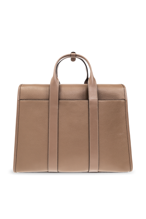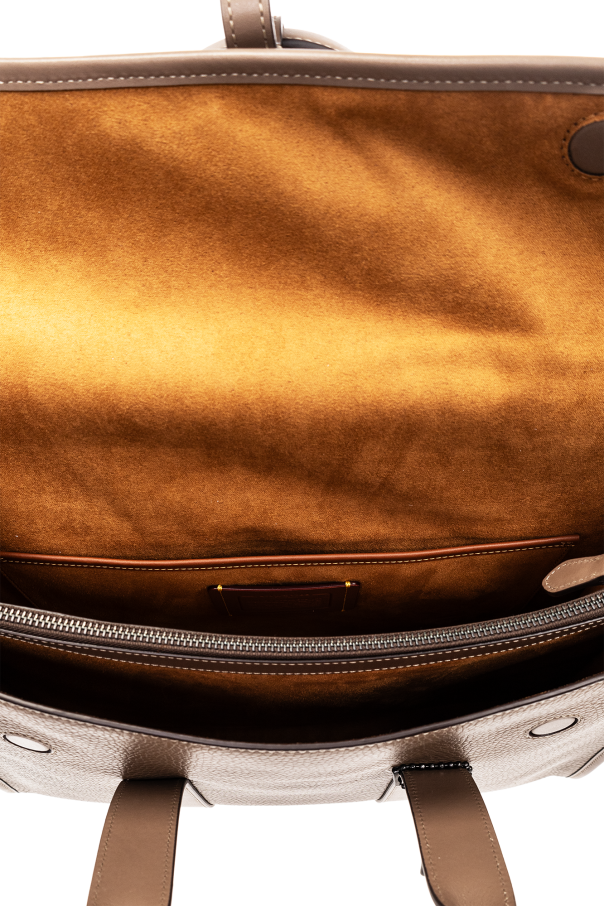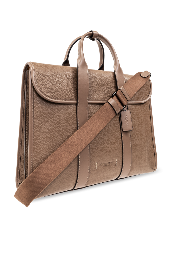 Brownish grey ‘Gotham Portfolio’ leather briefcase from Coach. Made from grained leather, this design secures with magnetic snaps and features an embossed logo on the front, one back pocket with a magnetic closure, the brand's signature charm and two half-round handles. It is complete with a detachable and adjustable shoulder strap, silver-tone metal hardware and one internal compartment with one zipped partition and four slip pockets.