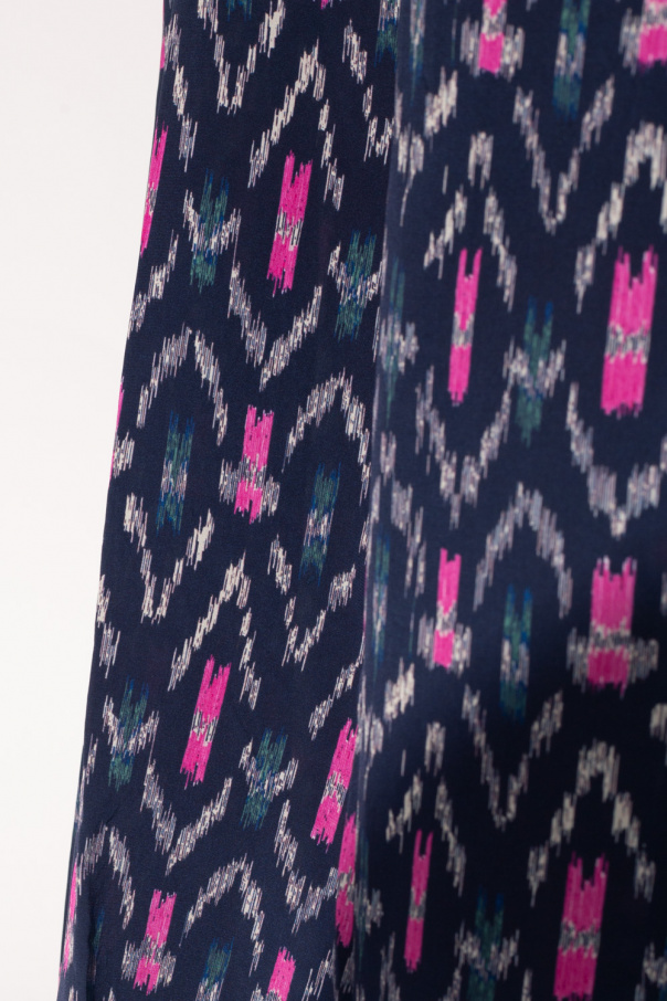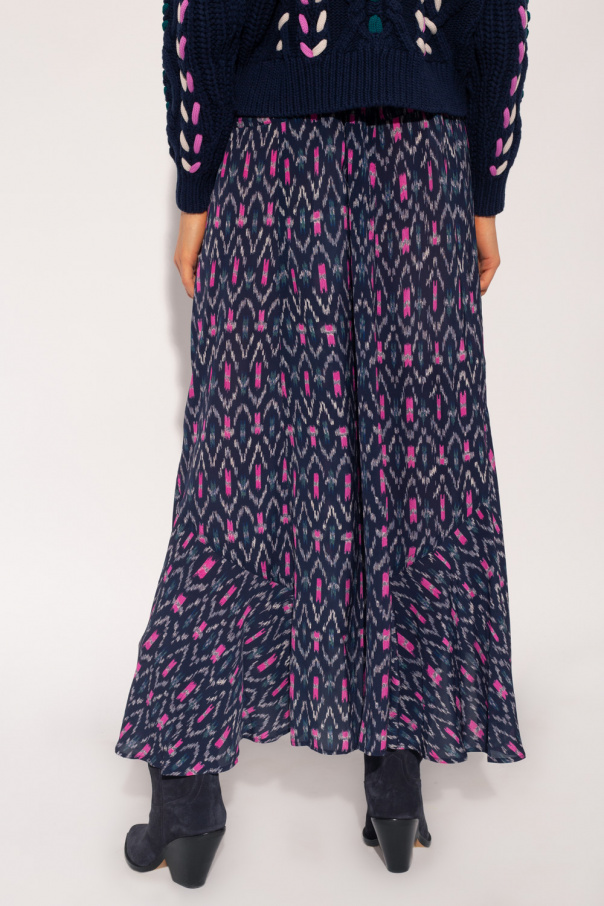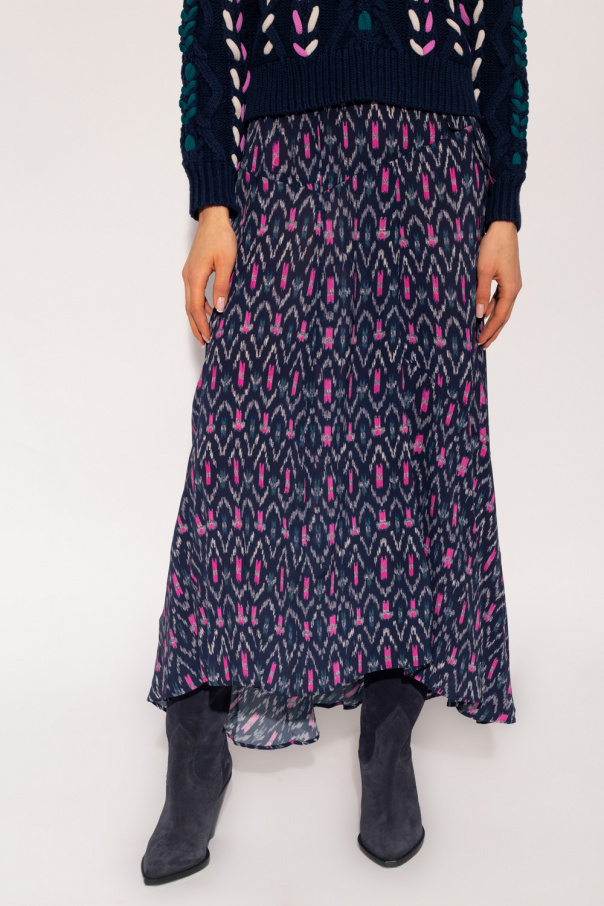 Navy ‘Alona’ high-waisted skirt from Isabel Marant Étoile. Fastened with drawstrings, this asymmetric design features a multicolored geometric pattern, logo motif and light, flared silhouette.