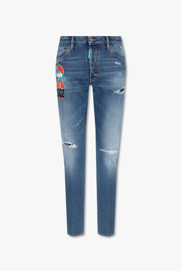 Blue jeans from Dsquared2 x The Smurfs, the ‘One Life One Planet’ collection. Made of cotton with a vintage effect, this pair falls with tapered legs and features button closures, classic five pockets and colourful graphic embroidery with a motif of ‘The Smurfs’ comic franchise.