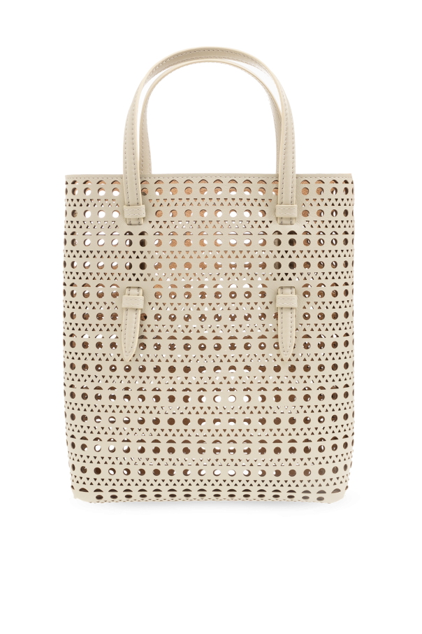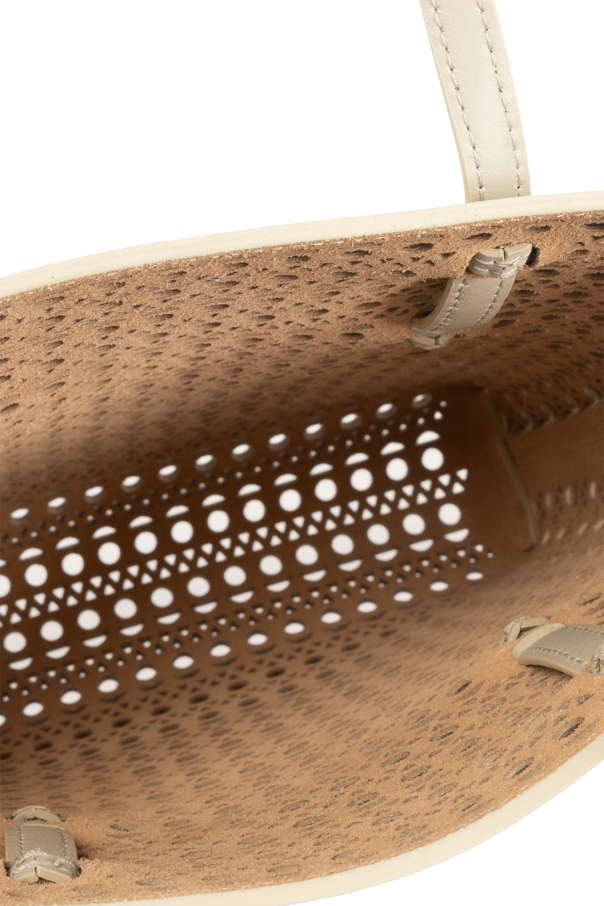 Greyish beige ‘Mina’ shoulder bag from Alaia. Made of calf leather, this design features the brand’s signature openwork ‘Neo Vienne’ pattern, two half-round handles, detachable and adjustable shoulder strap, one internal compartment and silver-tone metal hardware.