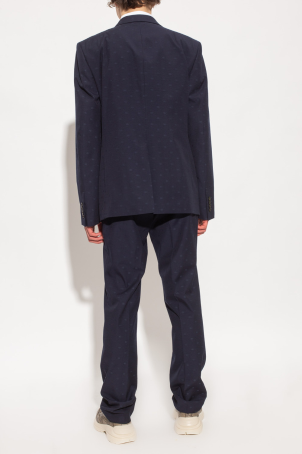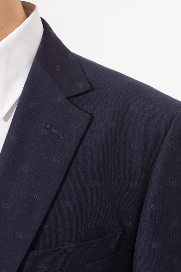 Navy blue suit from Gucci. Made of wool and decorated with the brand's GG pattern, this ensemble includes a blazer with button fastenings, notch lapels, three frontal pockets, including two flapped ones, and a single back vent and trousers with slightly tapered legs, a zip fly with a button and hook, two side seam pockets and two back button pockets.