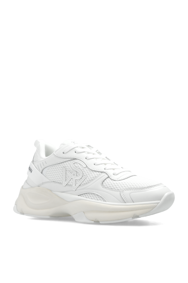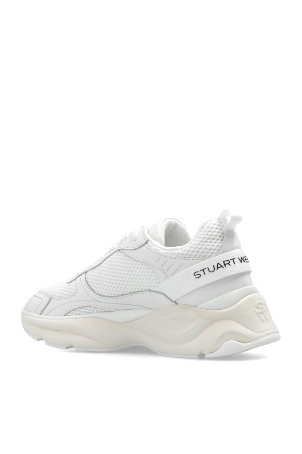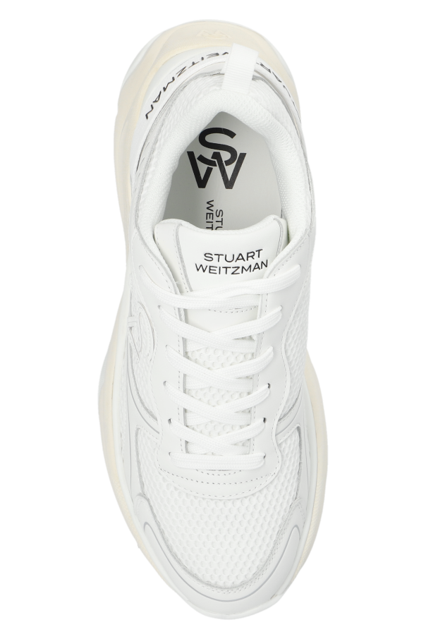 White ‘Trainer’ sneakers from Stuart Weitzman. Crafted from mesh, this lace-up pair features a monogram patch on the side, black logo on the tongue and back as well as a rubber sole in cream and white.