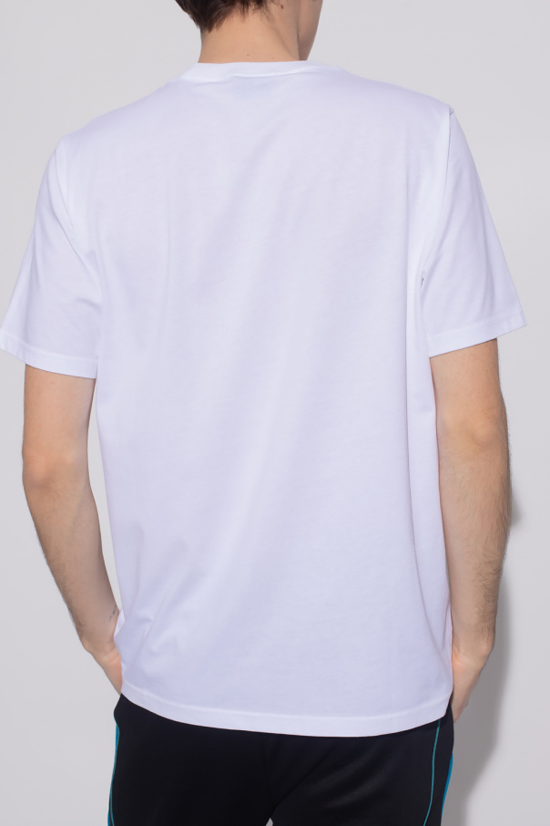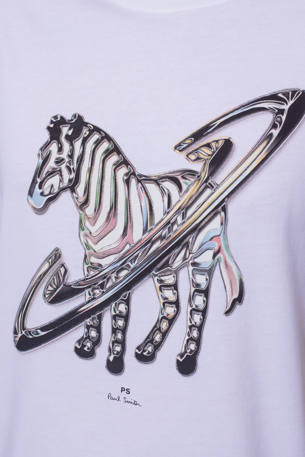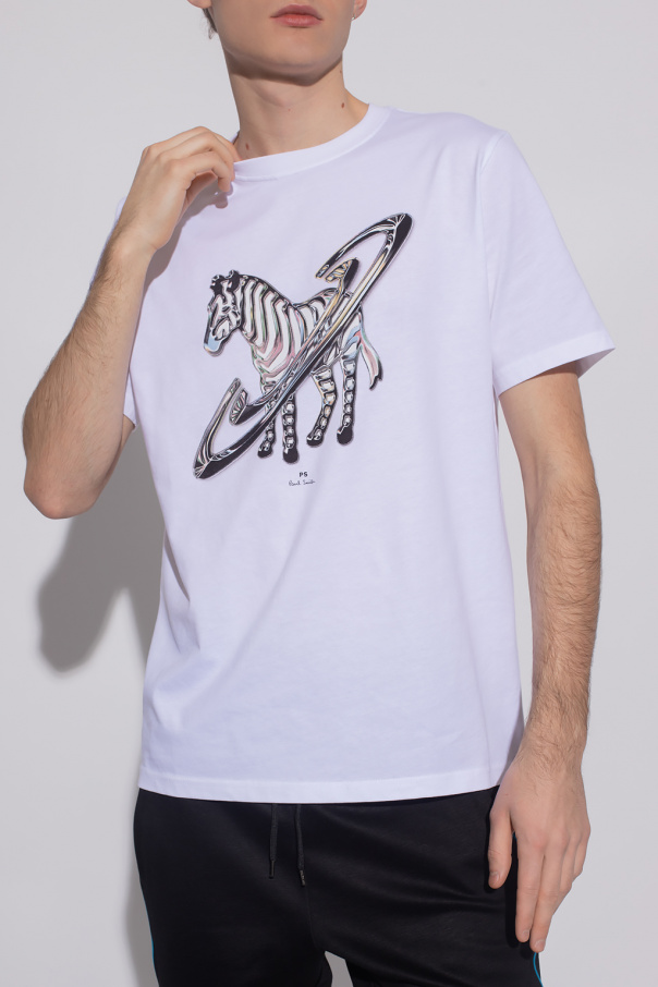 White crewneck T-shirt from Paul Smith. Crafted from organic cotton, this style features short sleeves, an elasticated collar, black logo detailing and a colourful graphic print with an animal motif on the front.