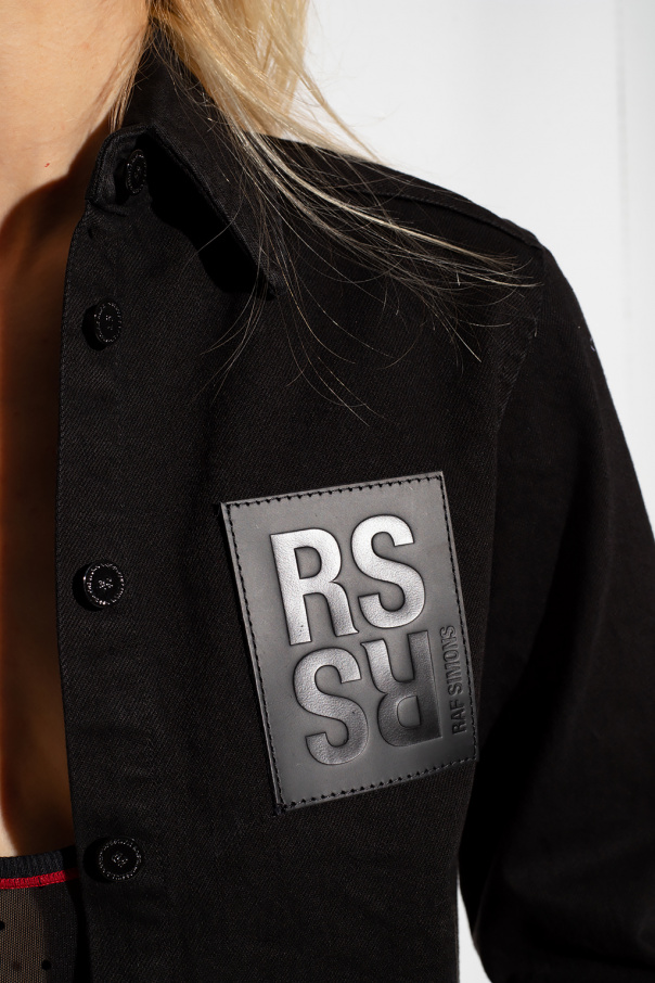 Black cropped denim shirt from Raf Simons. Fastened with buttons, this garment features a logo-embossed patch, metal logo appliqué, raw-trimmed hem and long sleeves with buttoned cuffs.