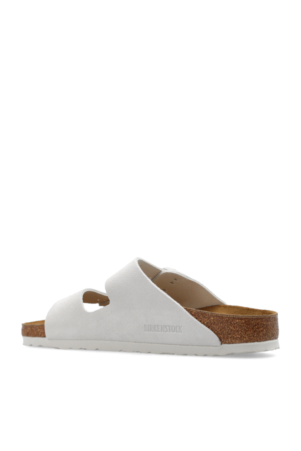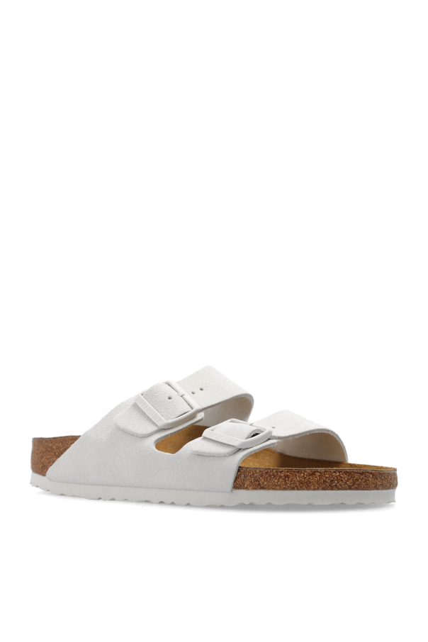 Cream ‘Arizona BS’ slides from Birkenstock. Crafted from suede, this pair features straps with engraved buckles in antique silver-tone, logo embossed on the side, tapered anatomically-shaped cork-latex footbed as well as a brown and cream sole constructed from natural cork and EVA foam.