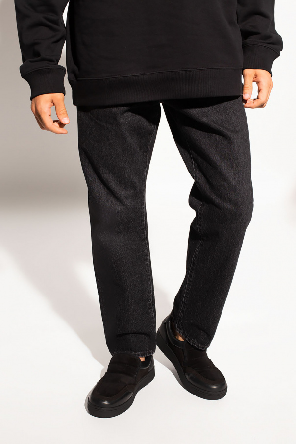 Black ‘Acne Studios 1996’ jeans from Acne Studios. Crafted from rigid denim, this pair falls with straight legs and features a mid-rise waist, zip fly with a button and classic five pockets.