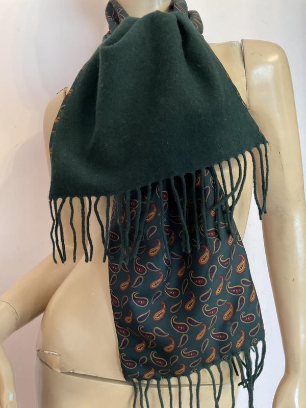 Хорошее качество. С одни стороны ткань низ более теплый как шерсть. Етикеток не мае . Основа зелена . Ширина 28 см длина 142 см без бахромы