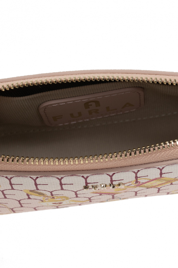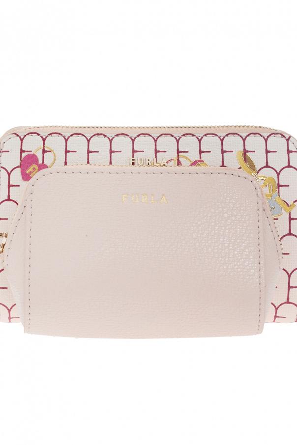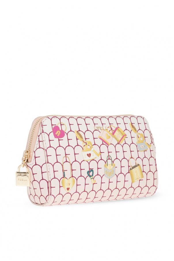 Blush pink ‘Lovely’ wash bag from Furla. Made of leather, this design features a zip fastening, multicolored print, metal logo, gold-tone metal hardware and one internal compartment with one slip pocket and a removable zipped pouch.