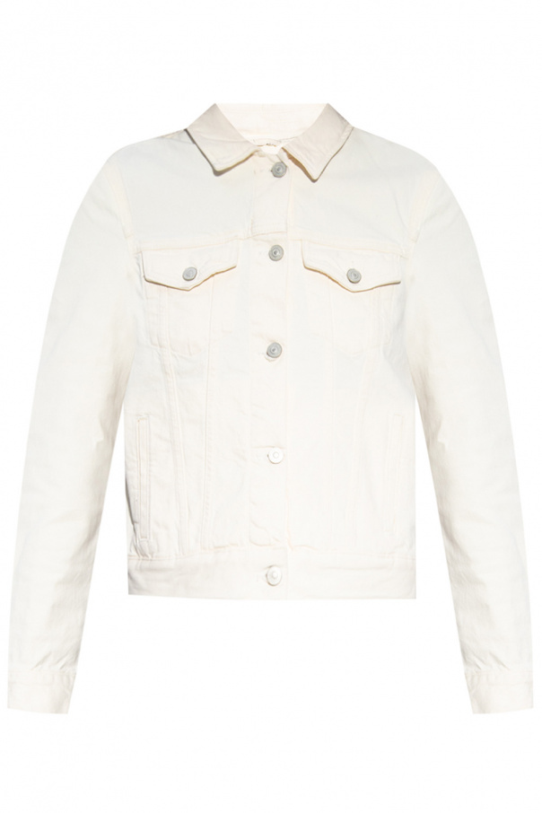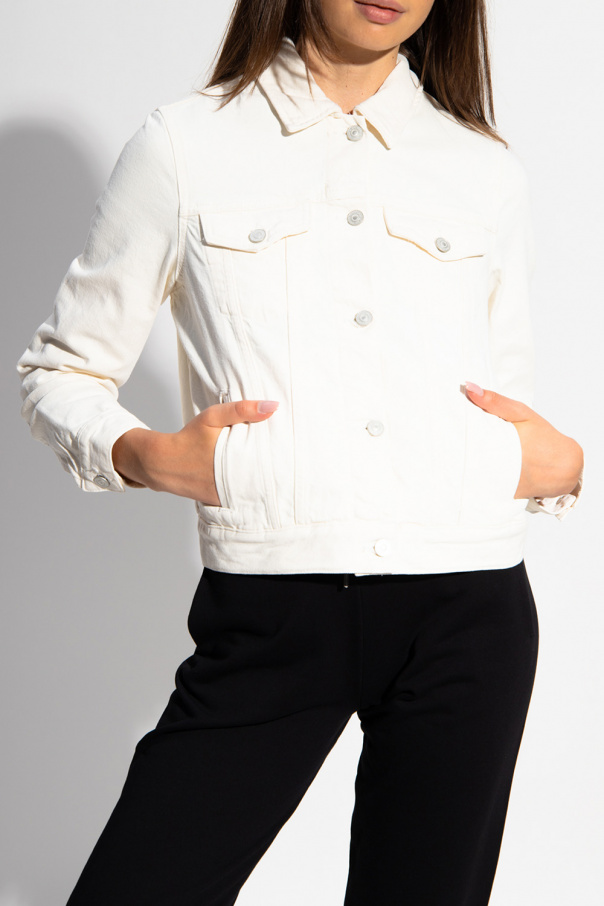 Cream ‘Hay’ denim jacket from AllSaints. Made of cotton, this design features button fastenings, two slip pockets and two buttoned flap pockets.