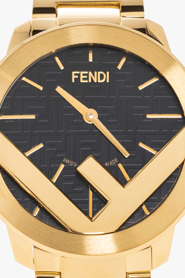 Gold-tone watch from Fendi. It features a 41 mm stainless steel case, stainless steel F insert, curved off-centre black sunray dial with a partially transparent FF monogram, gold coloured indices and hands as well as an adjustable bracelet with an engraved FF motif and clasp fastening.