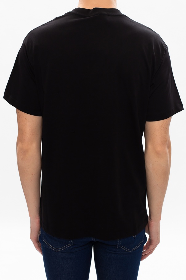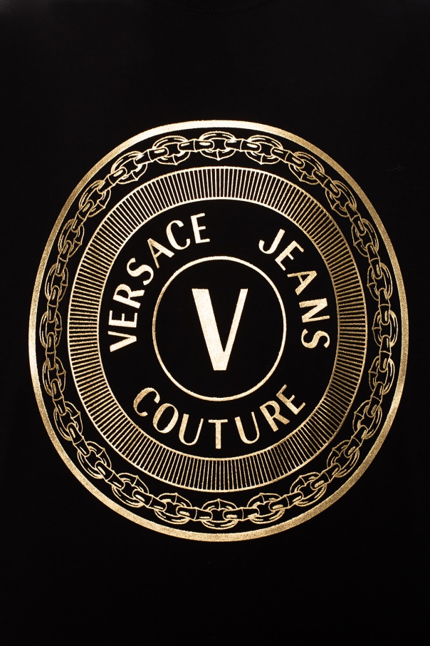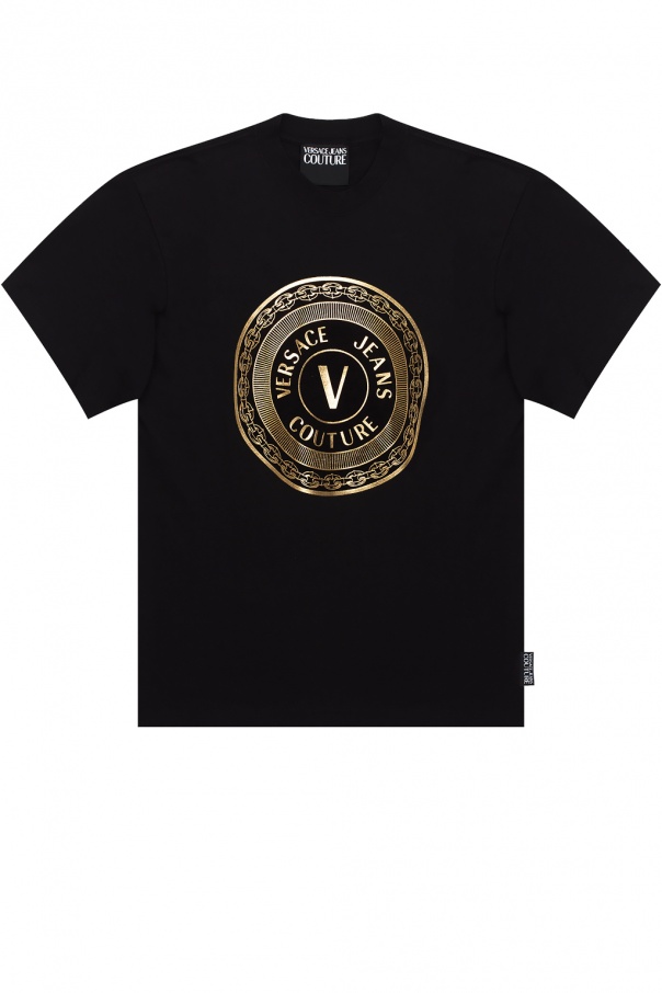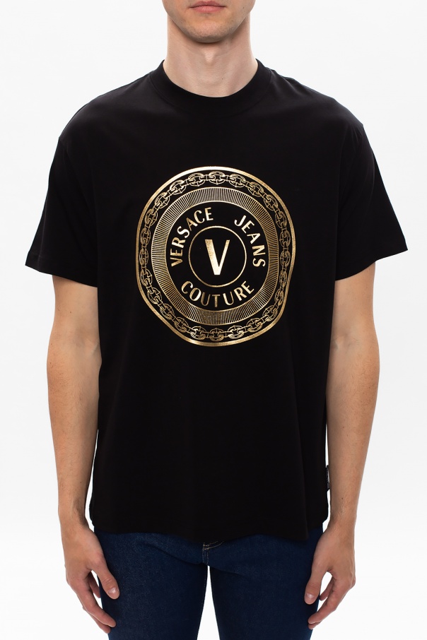 Black crewneck T-shirt from Versace Jeans Couture. Crafted from 100% cotton, this item boasts gold-tone graphic print with brand\'s logo on the front.