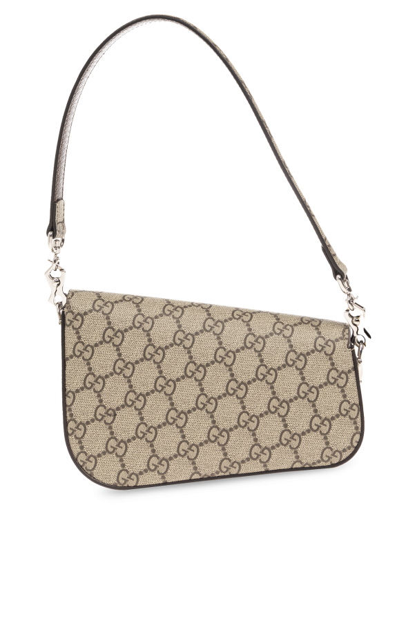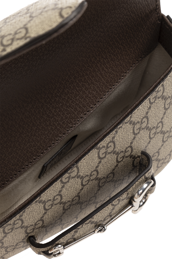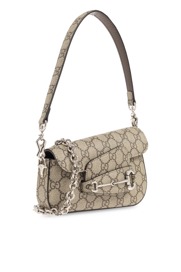 Beige and brown ‘1955 Horsebit Mini’ shoulder bag from Gucci. Made of the brand\'s signature ‘GG Supreme’ canvas and trimmed with leather, this design secures with a sliding horsebit fastener and features a detachable handle and chain shoulder strap, silver-tone metal elements and one internal compartment.