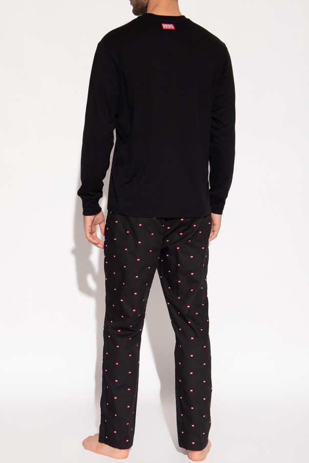 Black ‘UMKIT-JUSTIN-DERIK’ two-piece pyjama set from Diesel. Crafted from cotton and decorated with a red logo patch, it includes a crewneck top with long sleeves and bottom with an elastic waistband, two front slip pockets and red D logo embroidery.