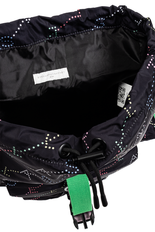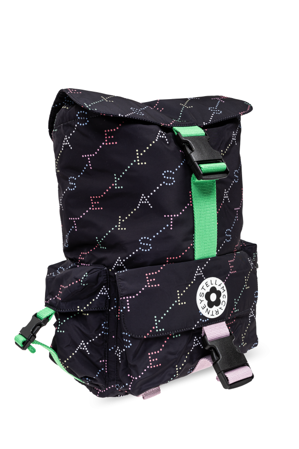 Presenting the Printed Backpack from the exclusive Stella McCartney Kids collection, a harmonious blend of elegance and functionality. Crafted with meticulous attention to detail, this backpack is the perfect accessory for the discerning young fashionista. The backpack features a rectangular shape with a flap closure for the main compartment, boasting a distinctive pattern of letters and dots in vibrant colors that form lines and arcs across its surface. Made from durable nylon or polyester, it promises both lightness and resilience. On the front pocket, you\'ll find a circular logo adorned with the text \"Stella McCartney\" and a charming flower at its center. The backpack is accentuated with green and pink straps and buckles, with a green strap running across the flap and pink straps embellishing the adjustable shoulder straps for a perfect fit. Designed with practicality in mind, the backpack is secured with a buckle and an additional drawstring inside the main compartment. It also features a front pocket with a flap and buckle closure, along with side pockets for extra storage, ensuring your child\'s essentials are always within reach. Why Choose This Product? Elegant and playful design by Stella McCartney Kids Durable and lightweight materials Adjustable shoulder straps for a customized fit Multiple pockets for ample storage Distinctive pattern and color accents