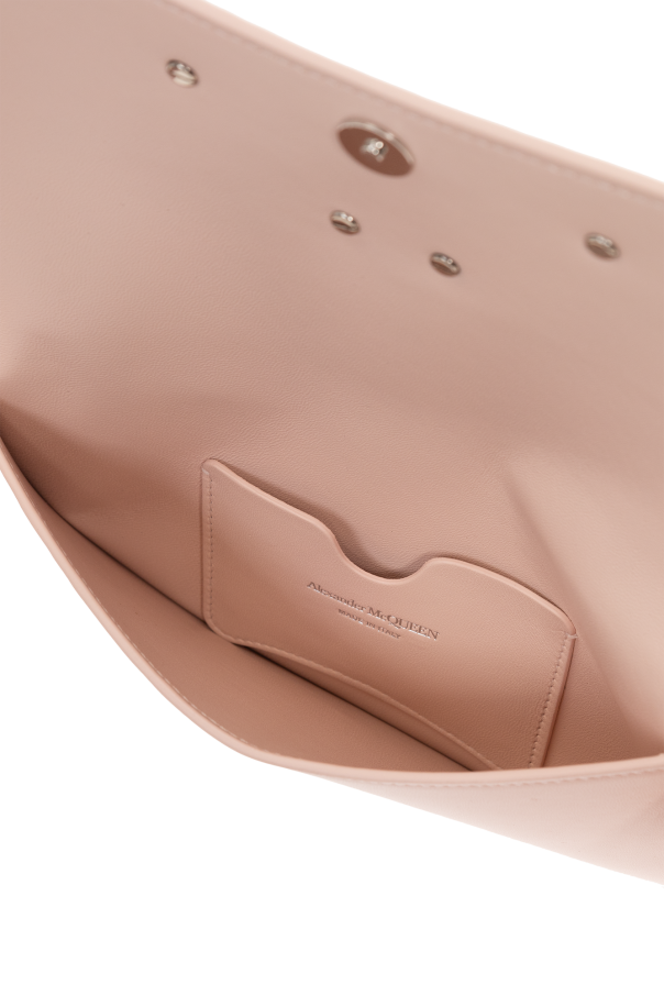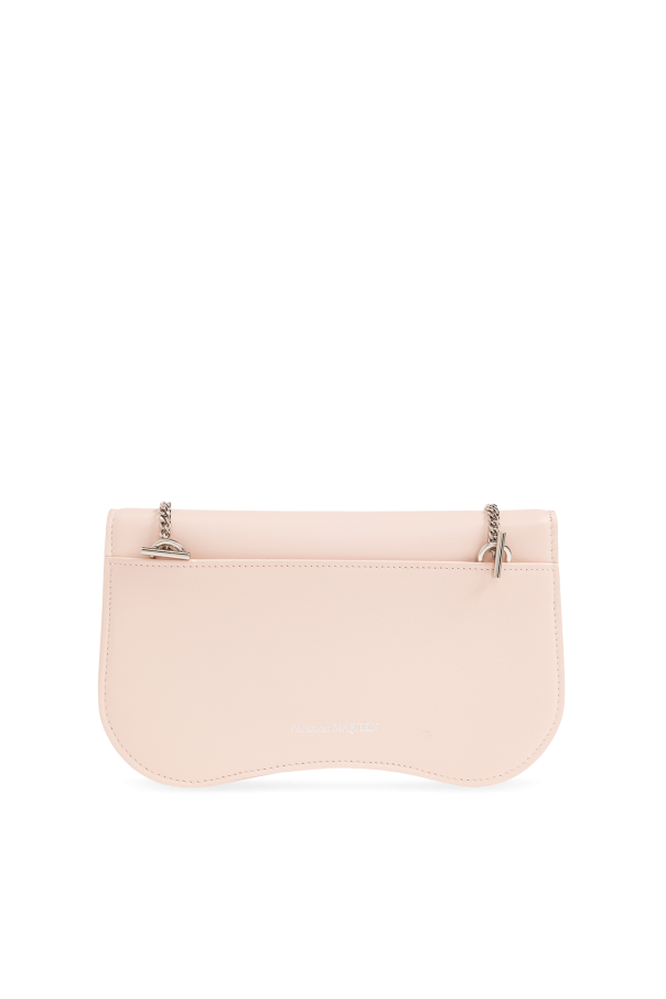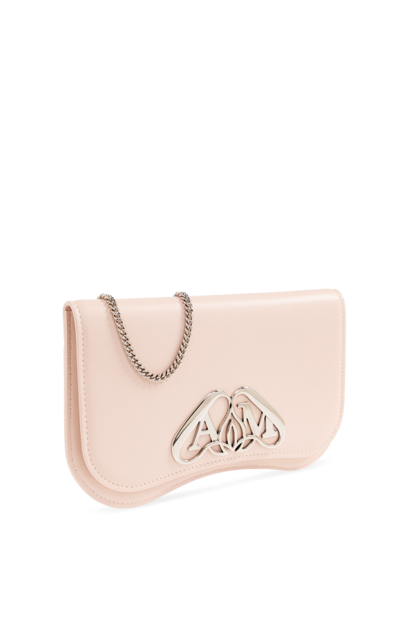 Light pink ‘Seal’ phone holder on a chain from Alexander McQueen. Made of lamb leather, this item fastens via a snap and showcases a metal logo plaque on the front, one slip pocket accompanied by a graphic print on the back, silver-tone metal hardware and one internal compartment with a card slot.