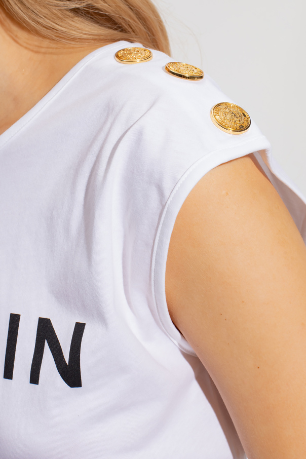 White crewneck tank top from Balmain. Made of cotton, this style features an embossed application and a black graphic print with the brand\'s logo.