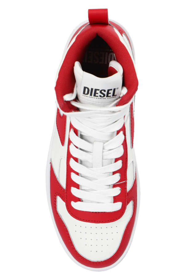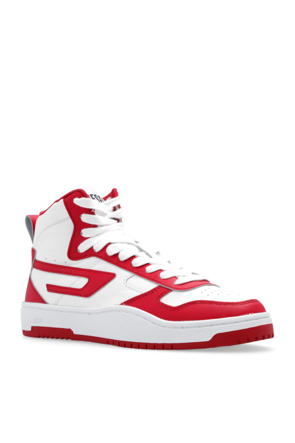 White and red 'S-UKIYO V2 MID’ sneakers from Diesel. Made of cow leather with a high-top silhouette, this lace-up model sits on a white and red rubber sole and showcases a logo patch.