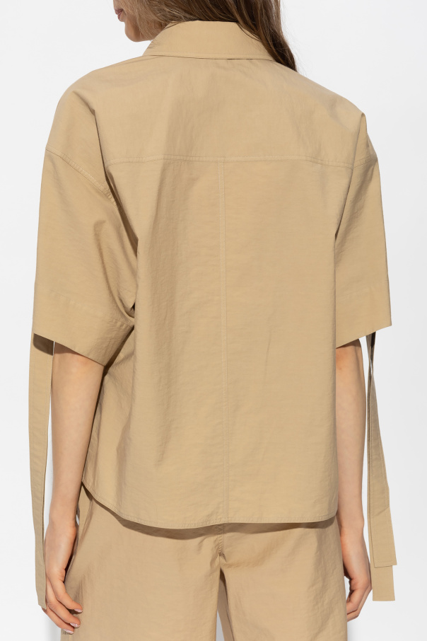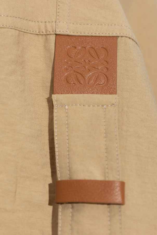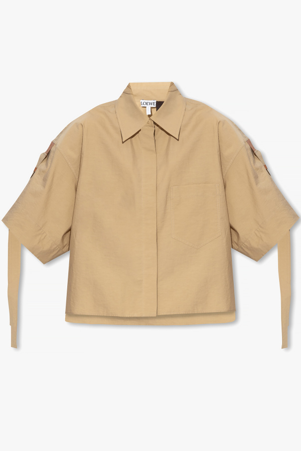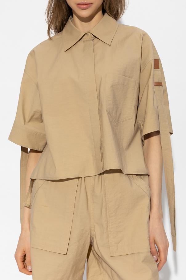 Beige shirt from Loewe x Paula’s Ibiza. Cut from cotton with a relaxed fit, this style fastens with buttons with a concealed placket and features a slip chest pocket, short sleeves with tie details and Anagram logo-embossed patches and an asymmetrical bottom with a long back hem.