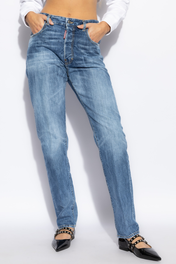 Introducing the Dsquared2 \'642\' jeans, a quintessential piece that encapsulates the essence of casual elegance with a touch of rugged charm. These jeans, crafted from 100% cotton, offer an impeccable blend of comfort and durability, ensuring they remain a staple in your wardrobe for years to come. The \'642\' model boasts a classic cut with slightly tapered legs, accentuated by the distinctive blue hue that showcases a tasteful stone wash effect. The variation in color, featuring both lighter and darker areas, adds depth and character to the jeans, making each pair uniquely appealing. The design is further enhanced by contrasting yellow stitching, a hallmark of the Dsquared2 brand, lending an air of sophistication to the overall look. Functionality meets style with the jeans’ five-pocket design and belt loops, providing practicality without sacrificing aesthetics. A standout feature is the metal button closure, embossed with the Dsquared2 logo, alongside the red brand tag placed unconventionally on the side seam. This thoughtful detail signifies the exclusivity and attention to detail that Dsquared2 is renowned for. Why Purchase This Product? Exclusive Design: Stand out with the unique placement of the Dsquared2 logo and red brand tag. High-Quality Material: Enjoy the comfort and durability of 100% cotton. Attention to Detail: The stone wash effect and contrasting yellow stitching add depth and character. Versatile Style: Perfect for a myriad of occasions, from casual outings to more dressed-up events.