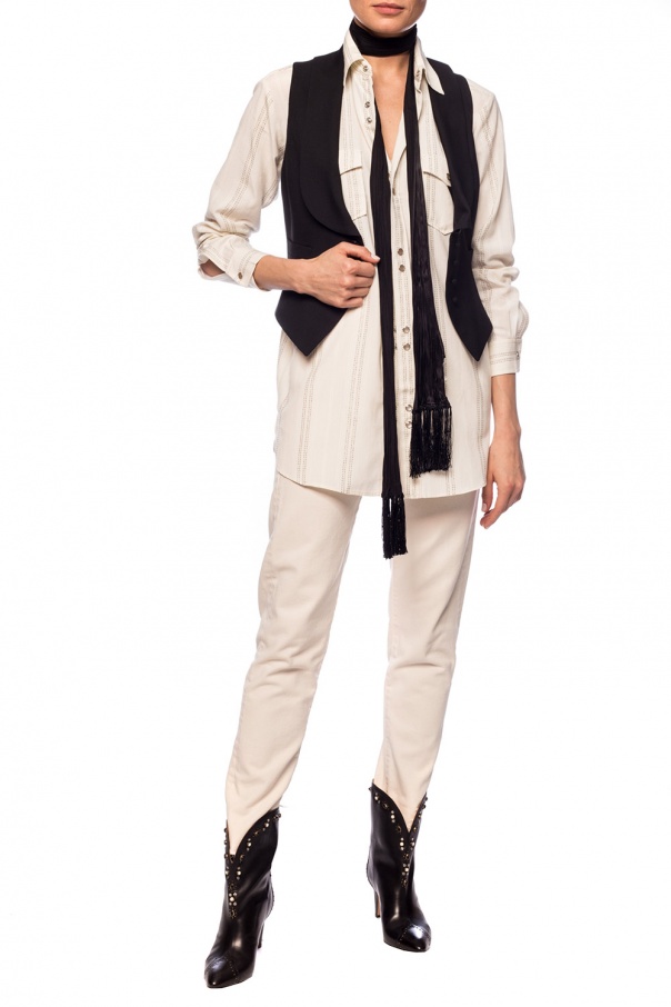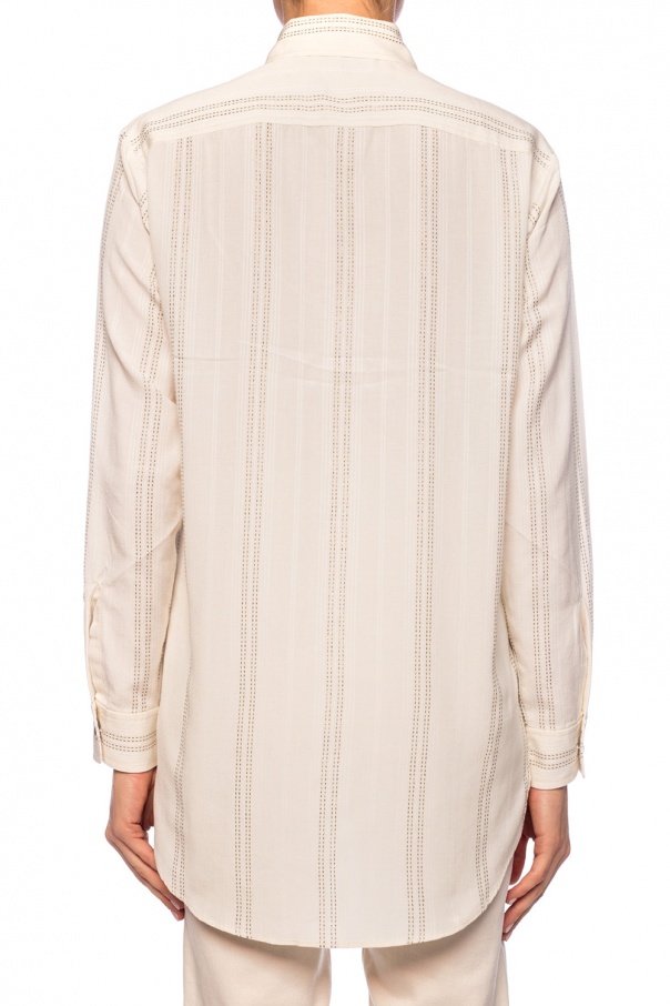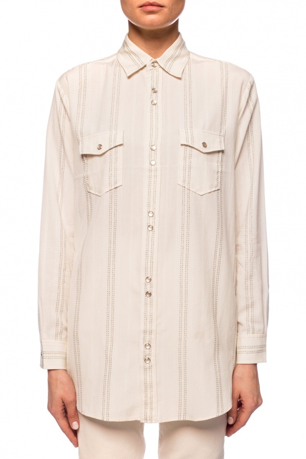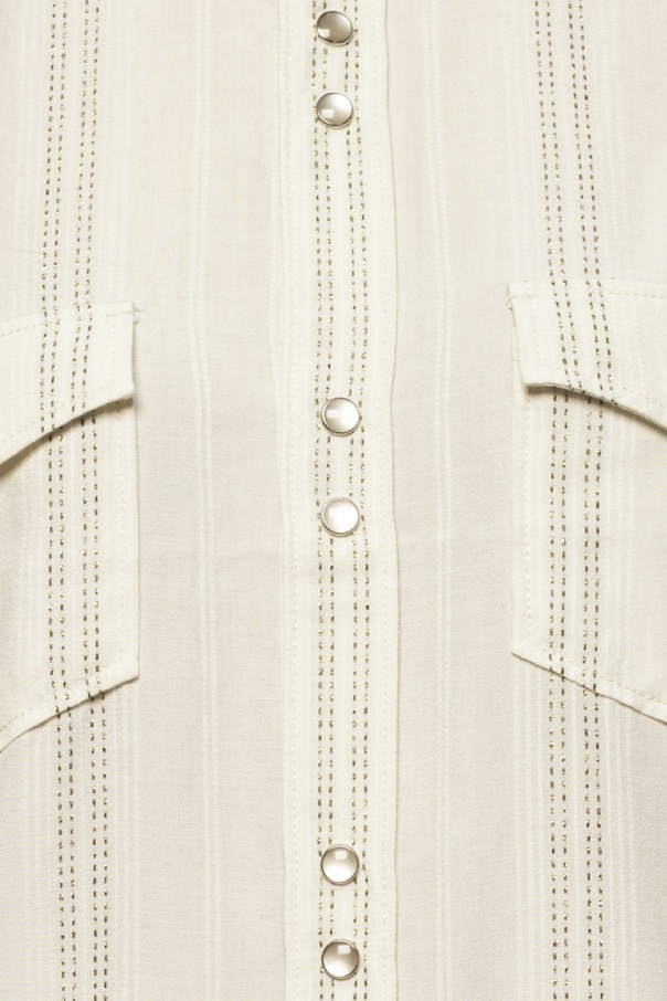 Cream shirt from Saint Laurent. Fastened with decorative snaps. Decorated with a vertical stripe pattern embroidered with a metallic fiber in white and gold-tone. Two pockets with snap fastenings on the front.