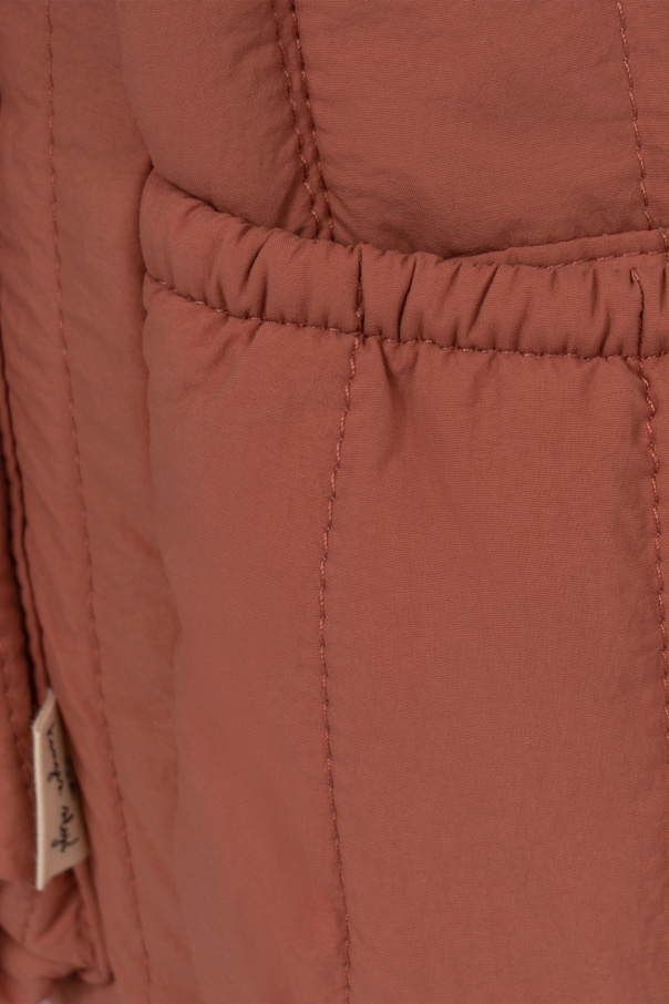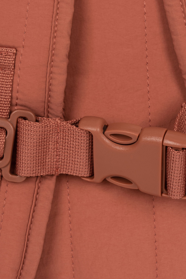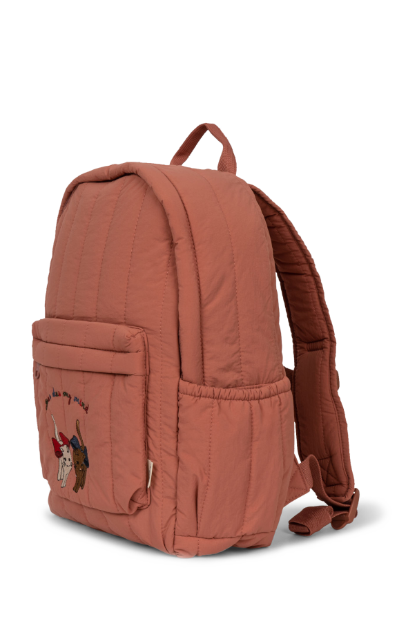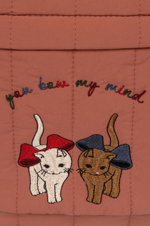 Pink ‘Juno’ quilted backpack from Konges Slojd. Made from fabric, this design fastens with a zip and showcases colourful graphic embroidery with cats and lettering, one zip front pocket, one top handle, adjustable shoulder straps, pink metal hardware and one internal compartment.