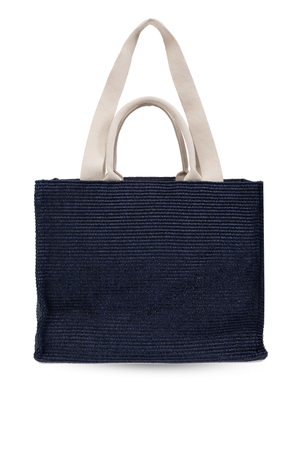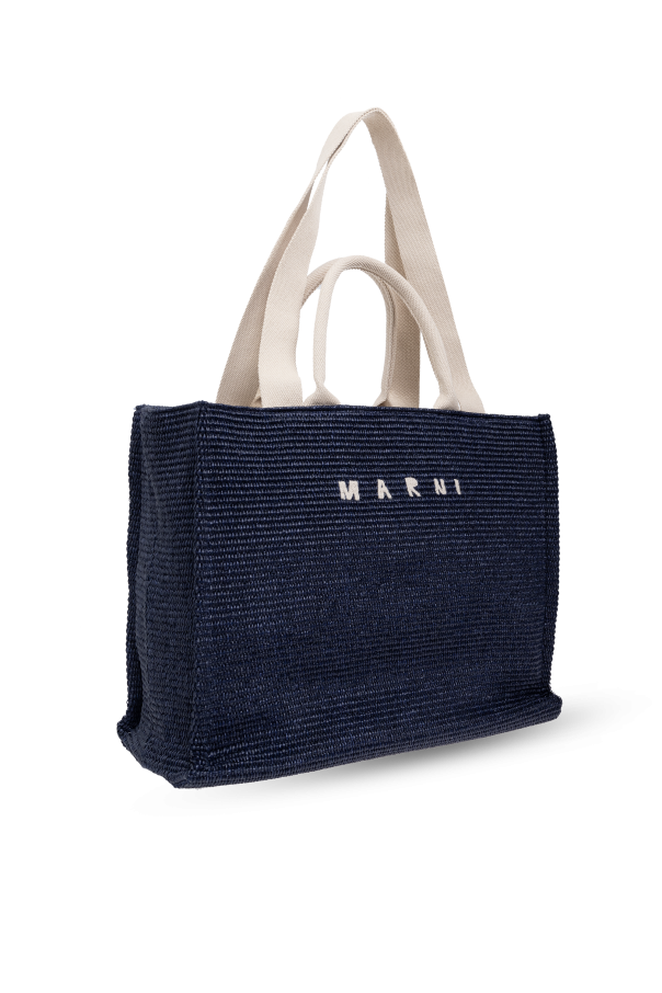 Introducing the Marni Shopper Bag, a testament to refined aesthetics and enduring utility. Crafted with meticulous attention to detail, this navy and cream shopper bag embodies the essence of luxury and functionality. The robust, interwoven fabric, a harmonious blend of leather, cotton, and polyamide, assures both high quality and durability. The bag\'s design is a study in elegant simplicity, featuring contrasting beige handles that offer a striking visual counterpoint to the navy body while ensuring a comfortable grip for carrying heavier loads. The front of the bag is adorned with the iconic white \"MARNI\" inscription, unmistakably asserting the bag\'s designer pedigree. Its straightforward yet sophisticated silhouette makes it versatile enough for everyday use and formal occasions alike. Functionality is at the heart of this design, with a secure latch closure leading to a spacious interior compartment, complete with a zippered pocket for safeguarding your valuables. The handles are robustly attached, highlighting the bag\'s readiness to accompany you on your most demanding days. Why Purchase This Product? Expertly crafted from a blend of leather, cotton, and polyamide for durability and style. Sleek, contrasting design with the distinct MARNi logo for an unmistakable elegance. Secure latch closure and an interior zip pocket ensure your belongings are always safe. Designed for versatility and strength, perfect for both daily tasks and special occasions.