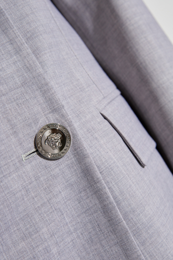 Introducing the epitome of sartorial elegance - the Double-Breasted Blazer by Versace. This masterpiece, rendered in a subtle light gray hue, is a testament to timeless style and meticulous craftsmanship. Its classic design is accentuated by a delicate pattern reminiscent of houndstooth or herringbone, lending it a sophisticated allure. The blazer boasts an array of ornate, metallic-shine buttons arranged in a double-breasted formation, with six prominent buttons adorning the front and three smaller, decorative buttons on the left sleeve, each bearing distinctive brand emblematics. The outer layer’s luxurious composition of 96% Virgin Wool and 4% Elastane, paired with an inner lining of 58% Cupro and 42% Viscose, ensures both supreme comfort and durability. Precision in tailoring is evident in the uniform fabric structure and flawless finishing touches, highlighting the exclusivity of this garment. Functionality marries fashion in the design of two symmetrical flap pockets at the front, adding both utility and an element of visual interest. The attention to detail extends to the color-coordinated threads used for button attachment, showcasing the brand\'s commitment to excellence. Why Purchase This Product? Designed by renowned fashion house Versace, ensuring unmatched quality and style. Exquisite materials and craftsmanship speak volumes of its luxury and durability. Iconic double-breasted design with decorative buttons adds a touch of elegance. Perfect blend of timeless design and modern sophistication.