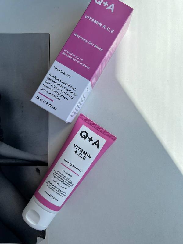 Q+A - Vitamin A.C.E - Warming Gel Mask - витаминная маска для лица, содержащая антиоксидантные свойства витаминов A, C и E, полученных из масел: жожоба, касторовой, абрикосовых косточек, экстрактах клюквы, ягод асаи и каму. Маска осветляет, согревает кожу при нанесении, а после мытья кожа становится увлажненной и сияющей. Добавление масла ши и семян какао создает на коже защитную пленку, которая защищает от вредного воздействия внешних факторов.