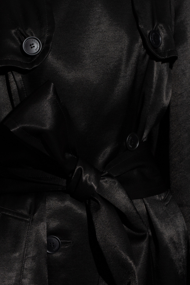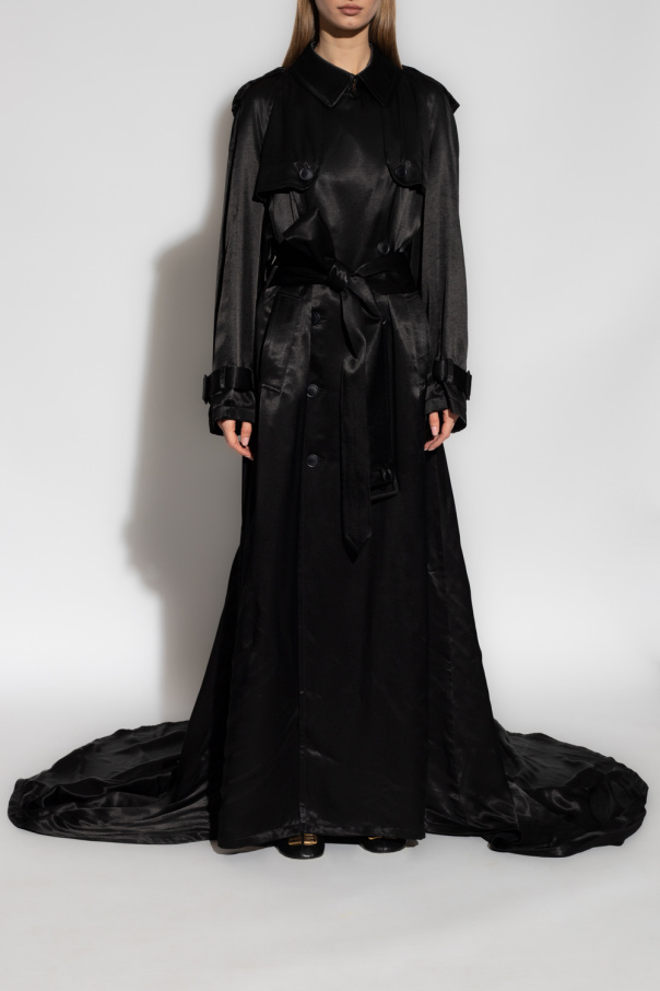 Black trench coat with a train from Balenciaga. Crafted from silk with a double-breasted silhouette, this style features button fastenings, a waist-cinching tie belt and two slip pockets.