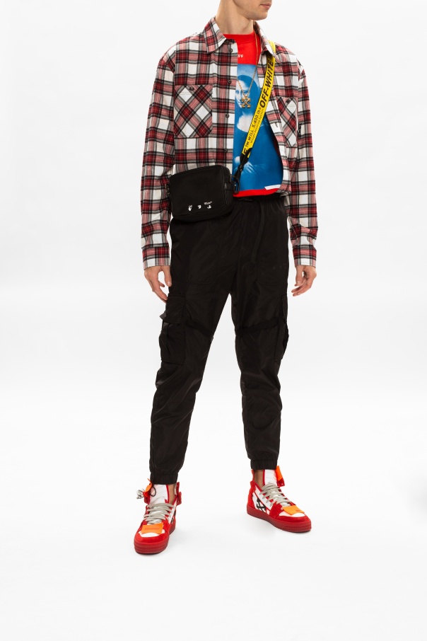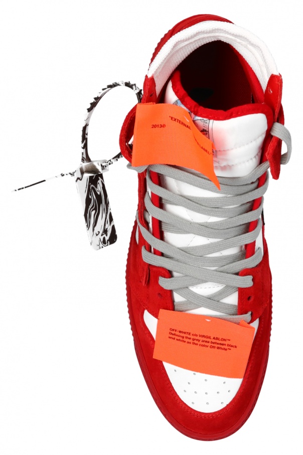 White and red ‘3.0 Off Court Vintage’ sneakers from Off-White. Boasting a high-top silhouette, this lace-up pair sits on a red rubber sole and showcases calf leather and suede upper with perforated details, neon orange patches and the brand's signature black and white zip tie tag.