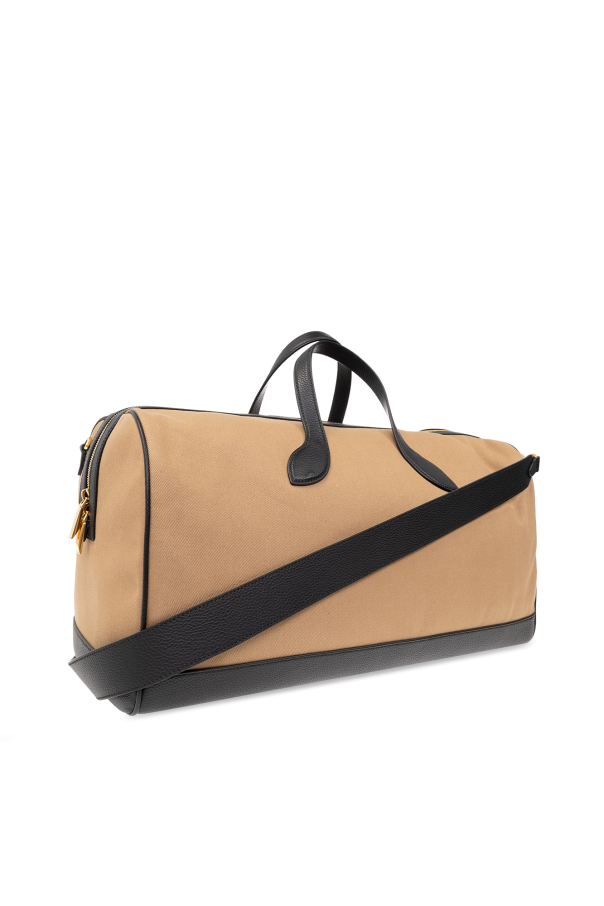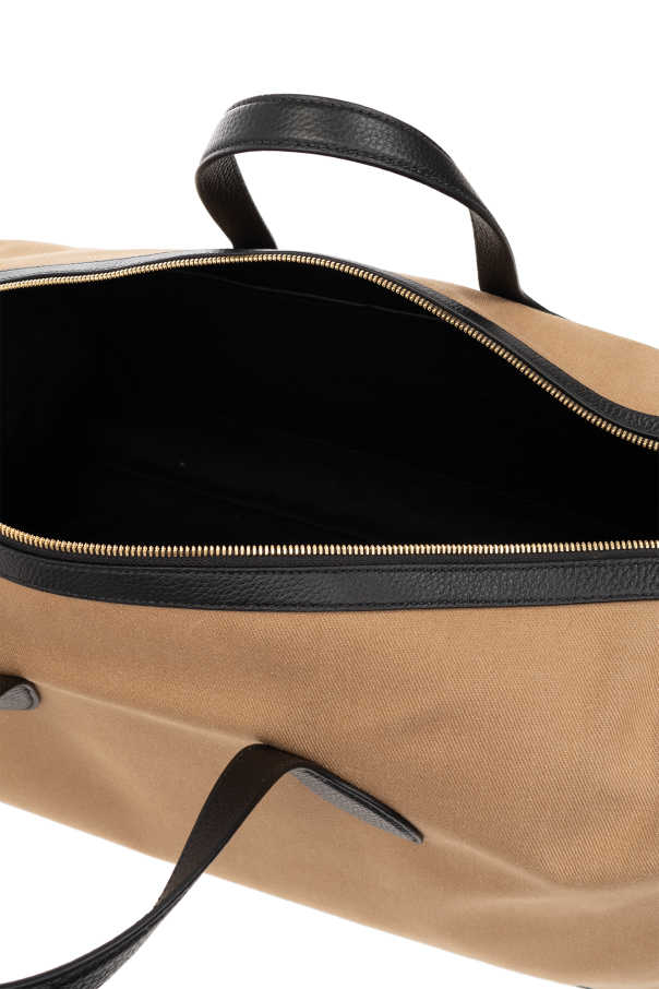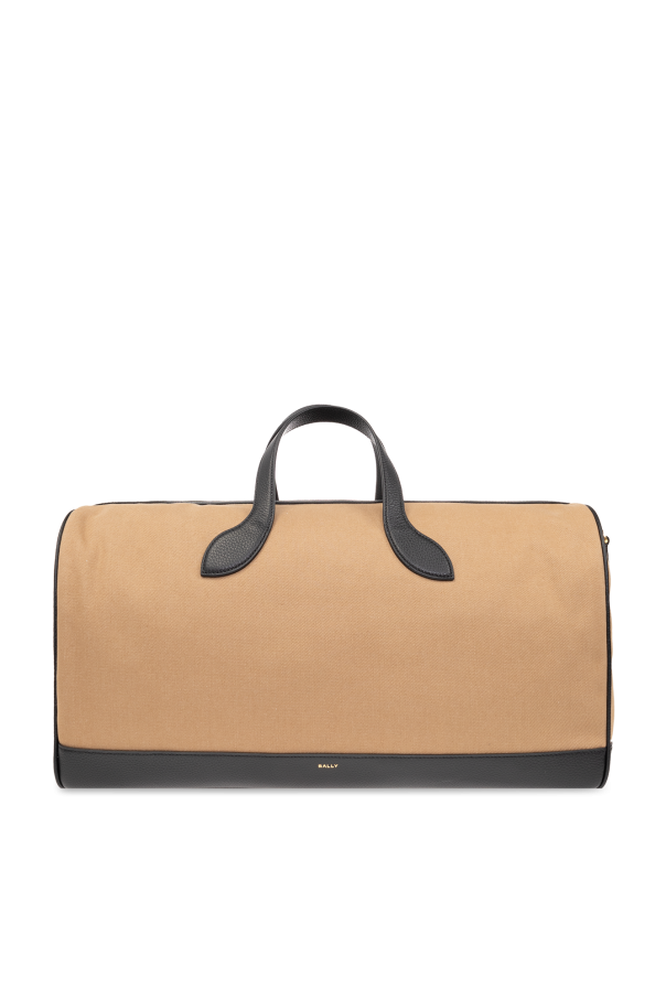 Light brown and black ‘36 Hours’ duffel bag from Bally. Crafted from organic cotton and trimmed with leather, this design secures with a two-way zip and showcases a printed logo. It is complete with a detachable and adjustable shoulder strap, two half-round handles, gold-tone metal hardware and one internal compartment with two slip pockets and one zip pocket.