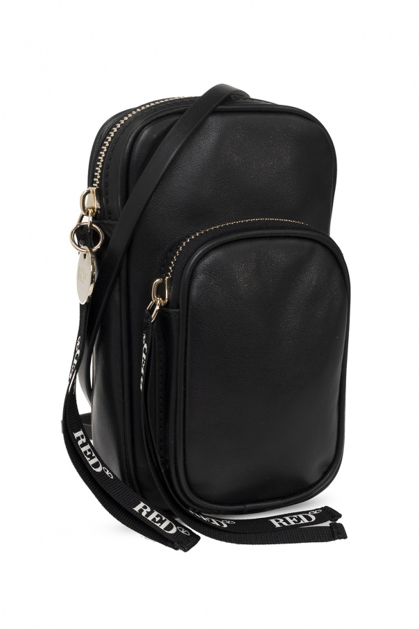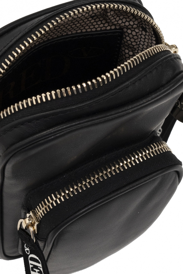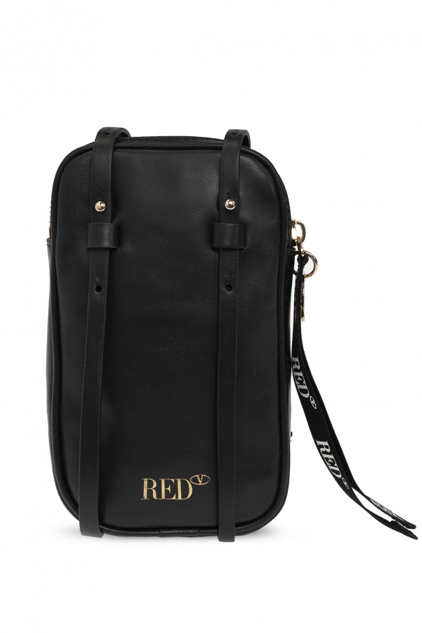 Black phone holder from Red Valentino. Made of calf leather, this design secures with a zip and showcases a gold-tone logo pattern. It is complete with a frontal zip pocket, a shoulder strap, light gold-tone metal hardware and one internal compartment.