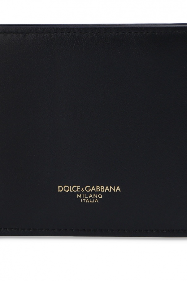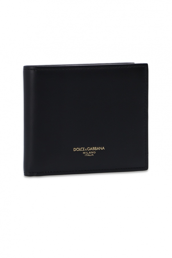 Black bifold wallet from Dolce & Gabbana. Crafted from leather, this item features a gold-tone logo print, bill compartment, two slip pockets and six card slots.