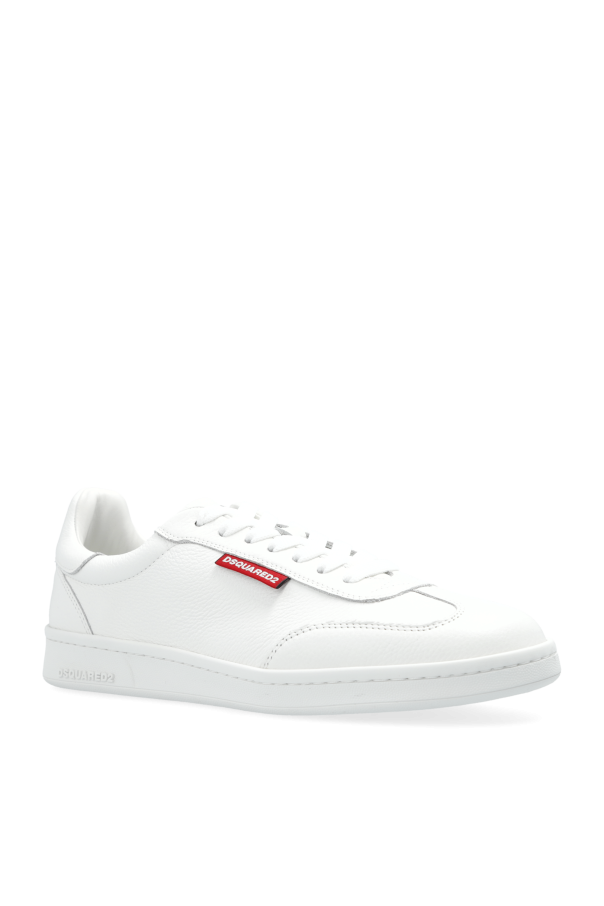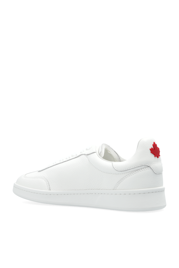 Presenting the epitome of athletic sophistication, the Dsquared2 Boxer Sneakers in pristine white. Crafted with impeccable attention to detail, these low-top sneakers exude elegance and durability, thanks to their premium leather construction. The Boxer sneakers feature a classic silhouette with a rounded toe, ensuring both style and comfort. Adorned with distinctive details, they boast a bold red \"DSQUARED2\" inscription on the side and a striking red maple leaf emblem on the heel, emblematic of the brand’s signature aesthetic. Designed with a minimalist yet modern flair, the internal logo adds a touch of exclusivity, while the traditional white laces offer a timeless appeal. The durable rubber sole, embossed with \"DSQUARED2,\" provides reliable traction and completes the refined look. Why Choose This Product? Crafted from high-quality leather for an elegant appearance and lasting durability. Classic low-top design with unique red accents, including the iconic maple leaf. Comfortable fit with traditional white laces and a rounded toe. Durable rubber sole with embossed branding for added sophistication. Minimalist design that seamlessly integrates into any wardrobe.