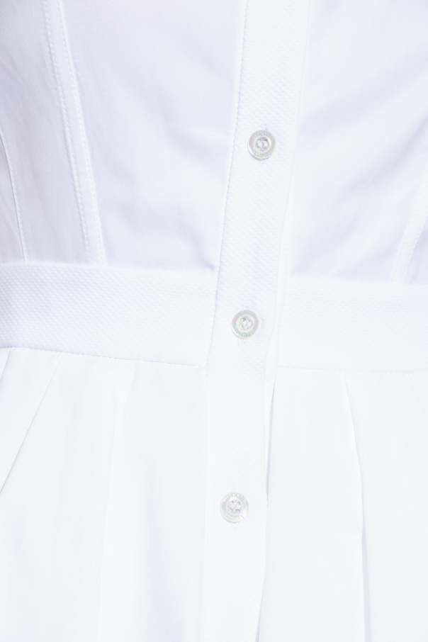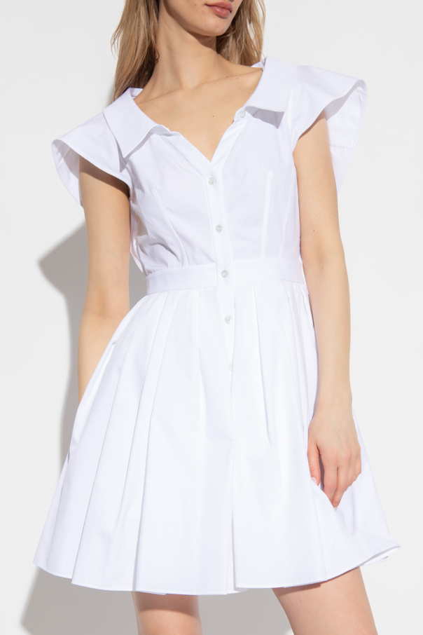 White mini dress from Alexander McQueen. Made of cotton, this flared design features button fastenings, a fitted waist with stitching details, a collar and short sleeves.