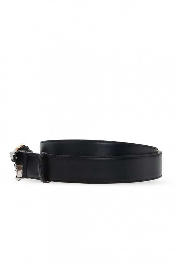 Black belt from Versace. Crafted from leather, this item is complete with a gold-tone and silver-tone appliquéd buckle closure.
