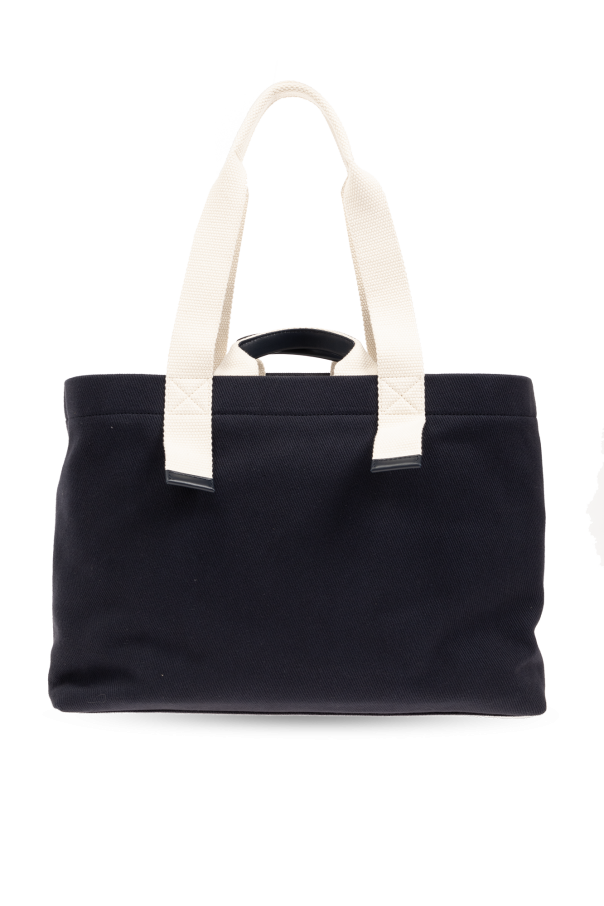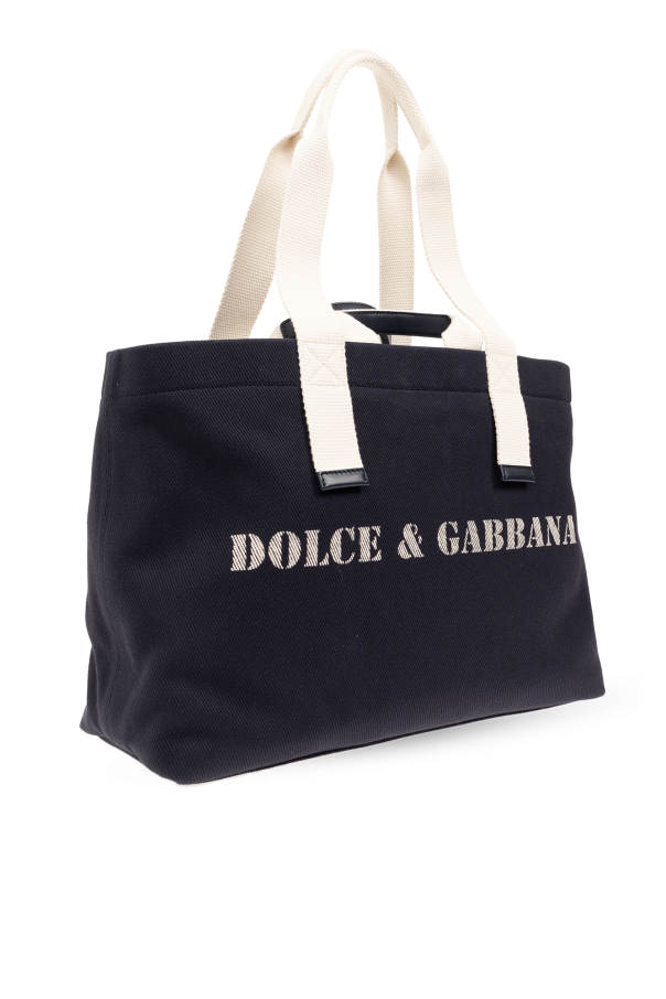 Navy and cream shopper bag from Dolce & Gabbana. Made of canvas with calf leather trims, this design features a logo print on the front, four handles and one internal compartment with two slip pockets and one zip pocket.