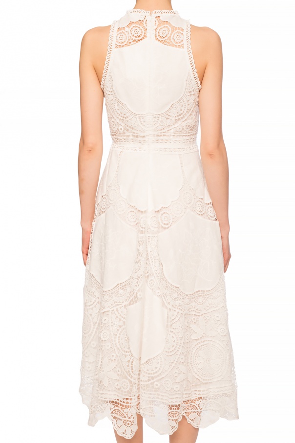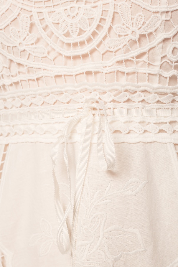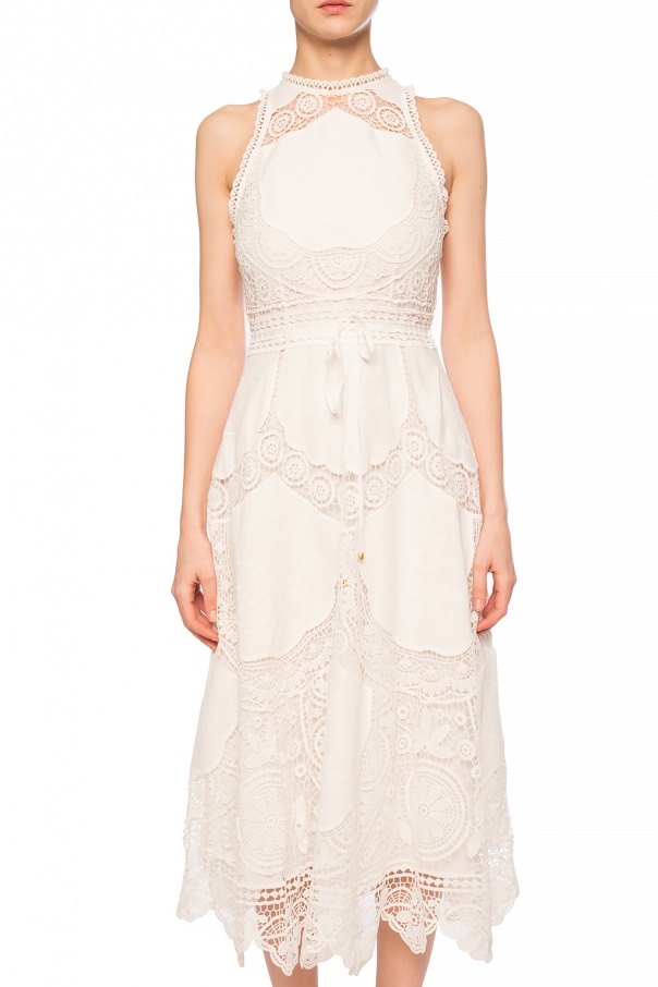 White openwork dress from Zimmermann featuring zip fastening on the back, self-tie fastening at the waist and crochet embroideries throughout.