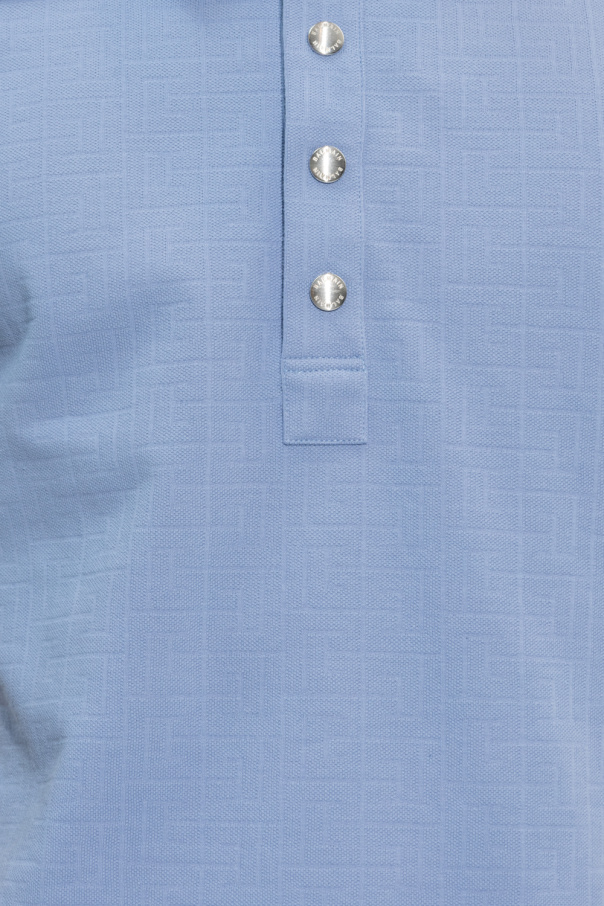 Blue polo shirt from Balmain. Crafted from monogrammed canvas, this item features snap closures on the collar and short sleeves with elasticated cuffs.