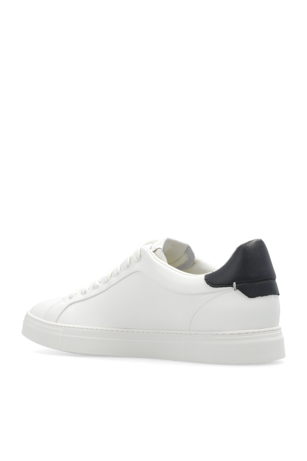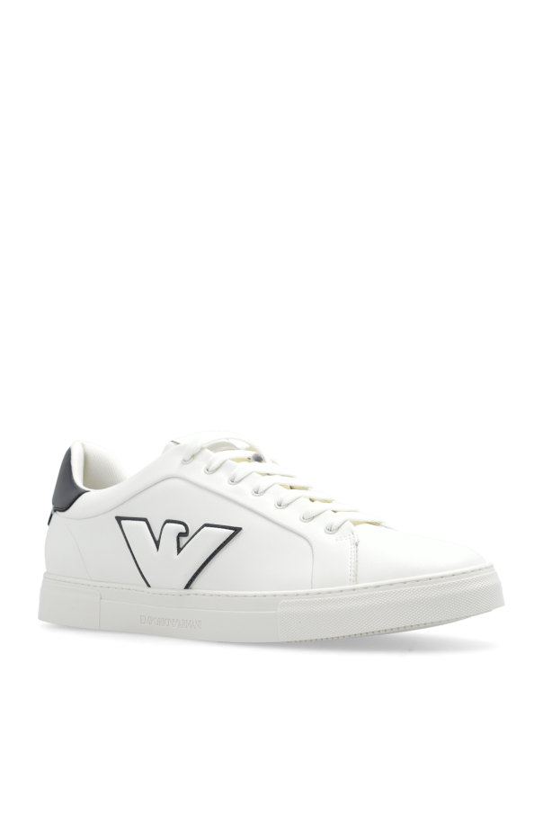White sneakers from Emporio Armani. Made from leather, this lace-up model sits on a white rubber sole and showcases a navy blue heel counter as well as a tongue patch with the brand\'s logo and an application on the side.