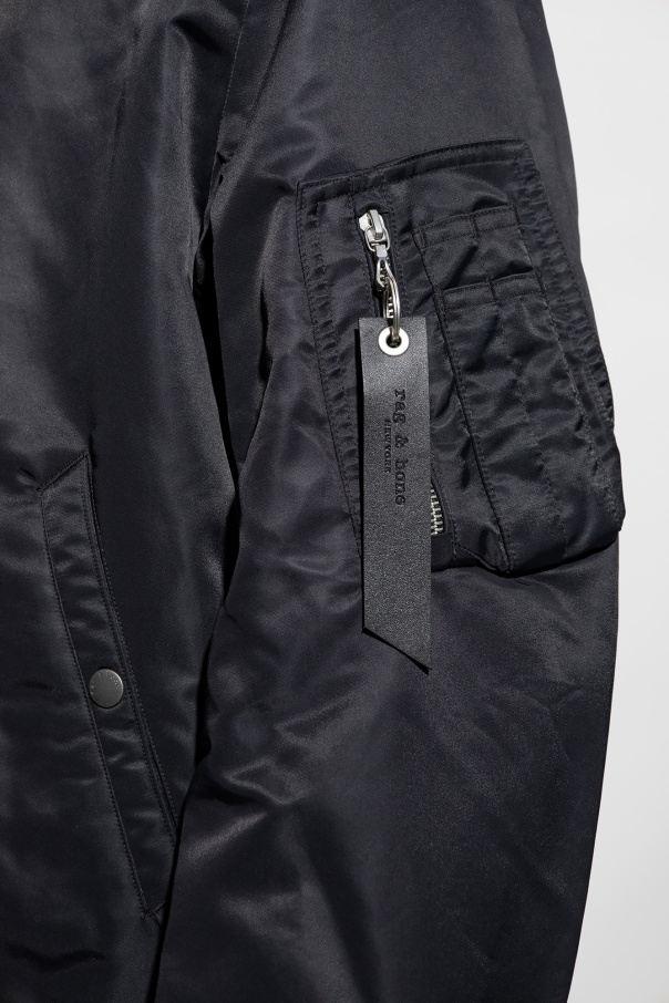 Black ‘Manston’ bomber jacket from Rag & Bone. Crafted from recycled materials, this style features a zip fastening, two snap-fastened pockets on the front, one zip pocket and four slip pockets on the sleeve and ribbing on the collar, bottom hem and cuffs.