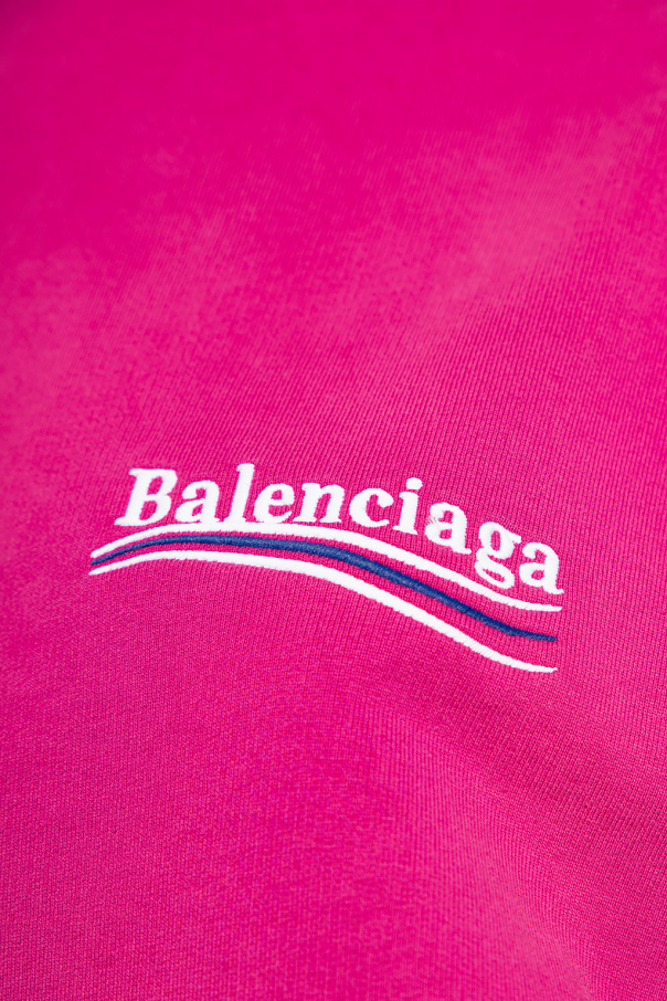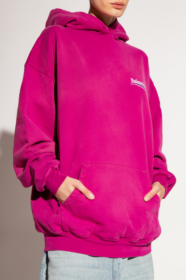 Pink loose-fitting hoodie from Balenciaga. Made of cotton, this garment features an embroidered logo pattern in white and navy, slip pocket and ribbed trims at the hem and cuffs.