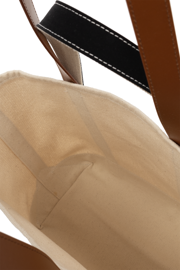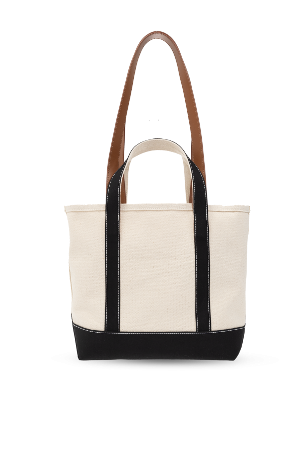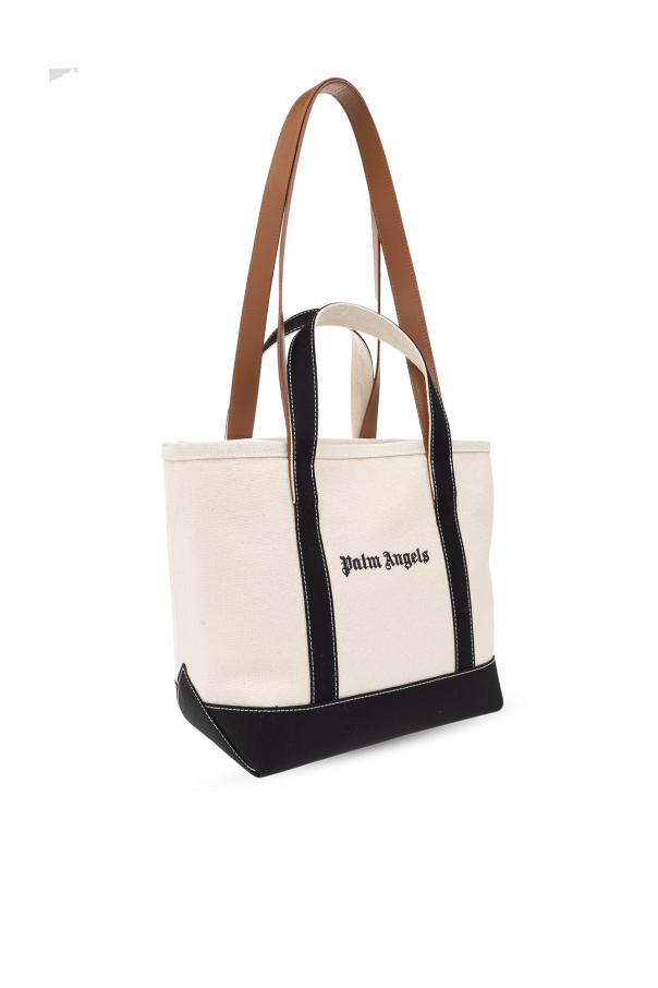 Beige, black and brown shopper bag from Palm Angels. Made of cotton, this design showcases an embroidered logo on the front, four half-round handles (two are made of calf leather), and one internal compartment.