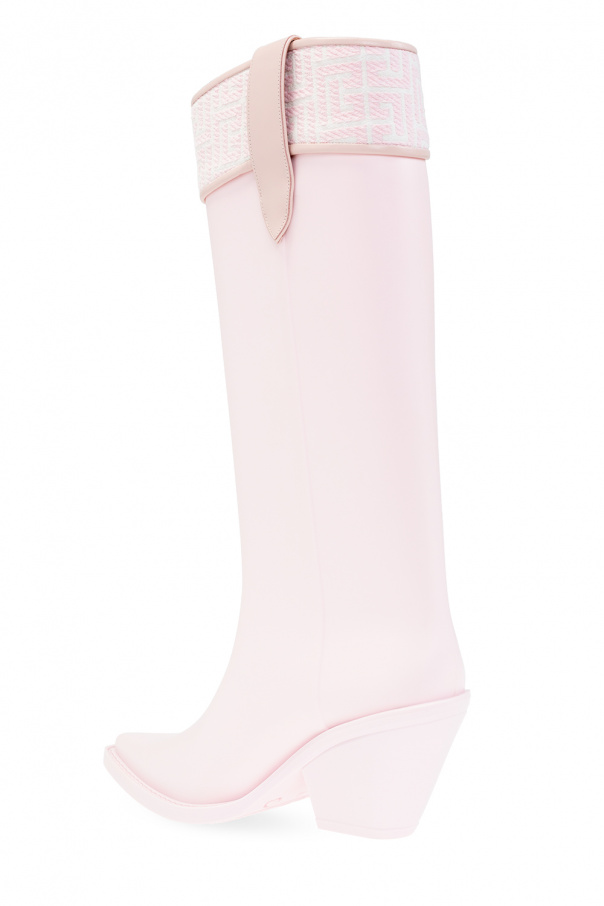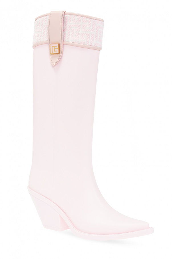 Light pink ‘Tess’ heeled rain boots from Balmain. This pointed toe silhouette is complete with straps with a metal appliqué in light pink and gold-tone, embroidered monogram pattern, decorative heel and light pink rubber sole.