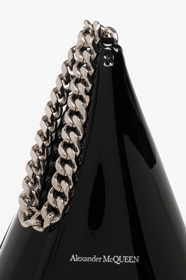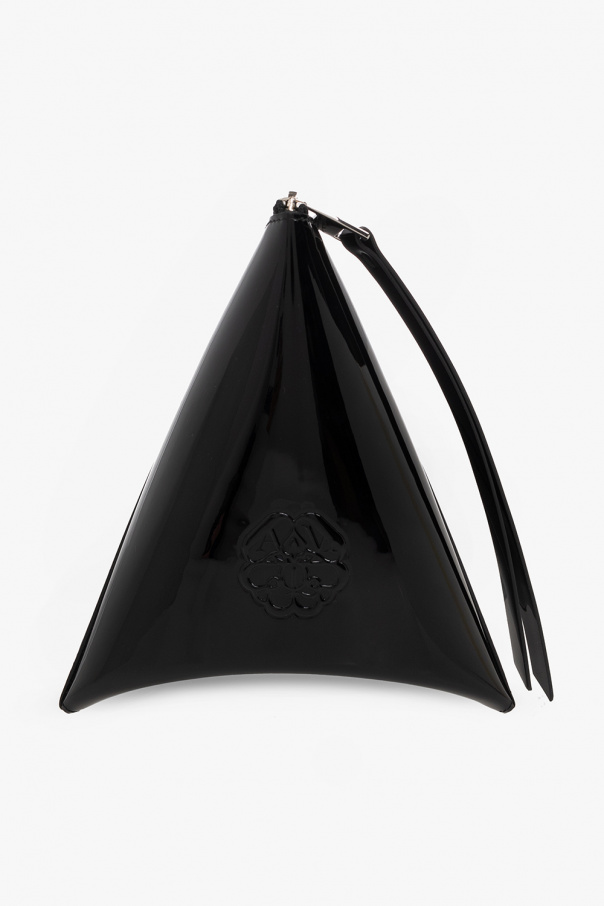 Black ‘The Curve Pouch’ handbag from Alexander McQueen. Crafted from patent calf leather, this model fastens with a zip and is decorated with an embossed ‘Seal’ motif and silver-tone logo print. It is complete with a wrist chain, silver-tone metal hardware and one internal compartment with red lining.